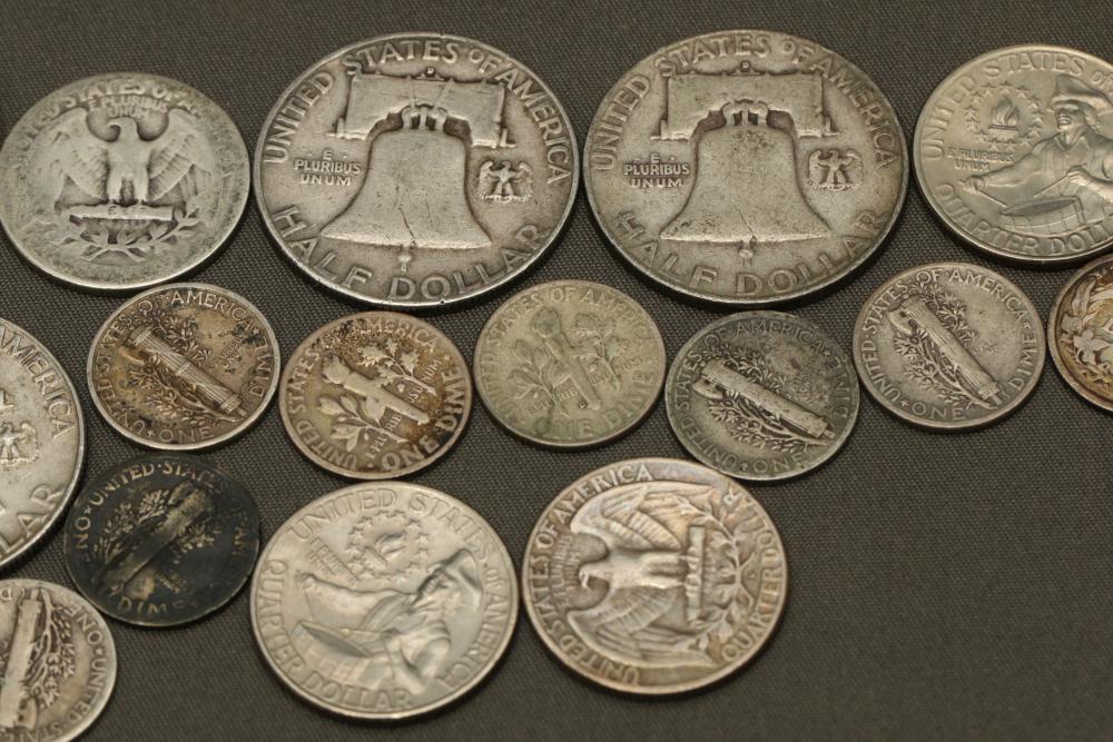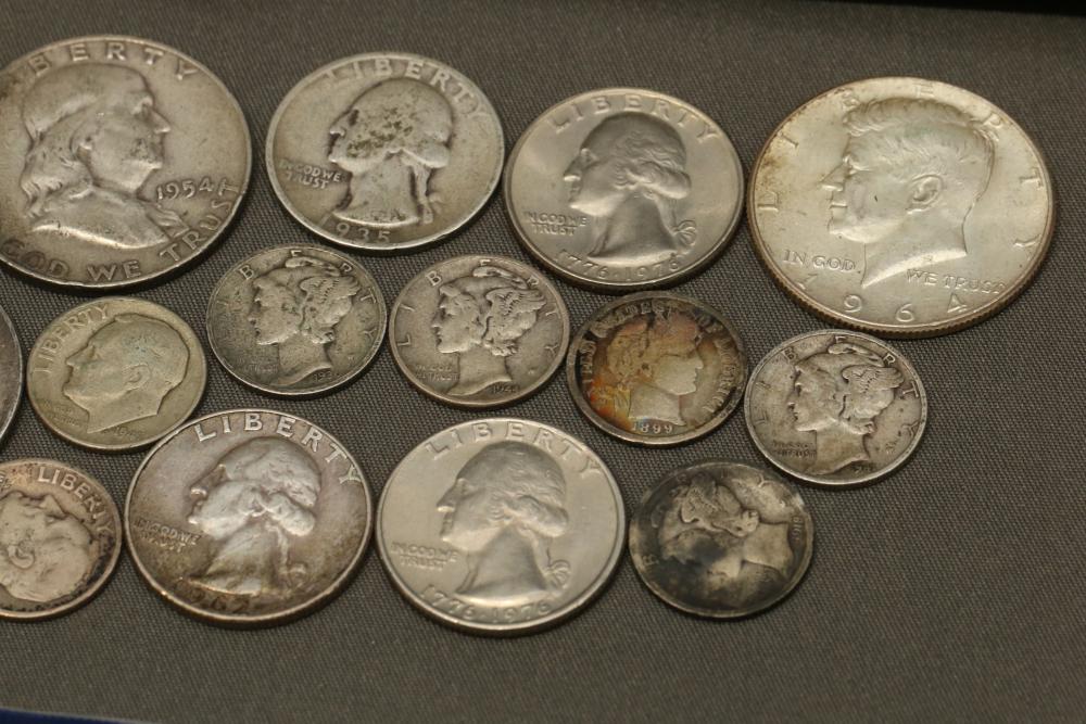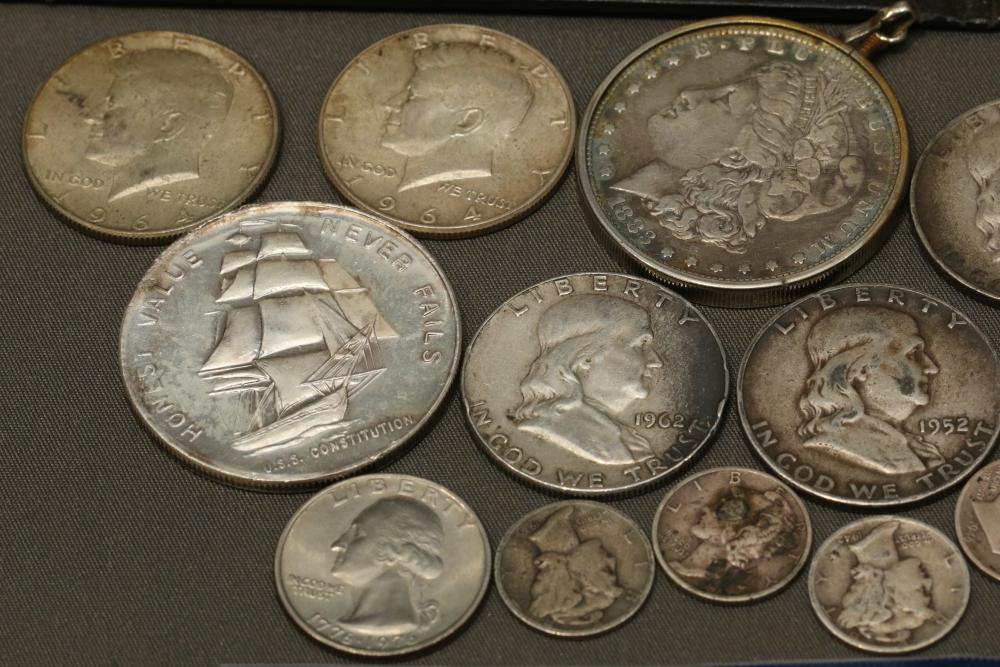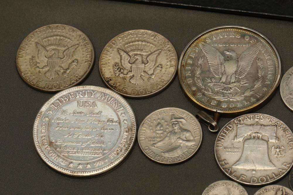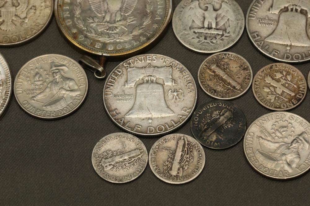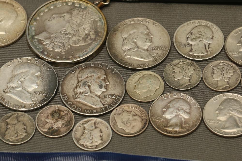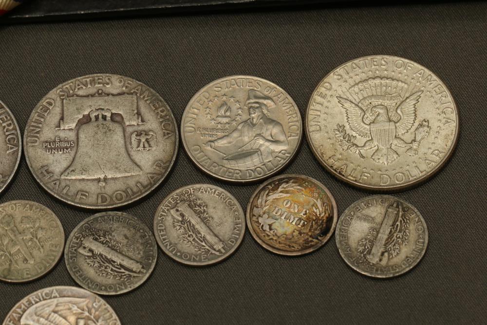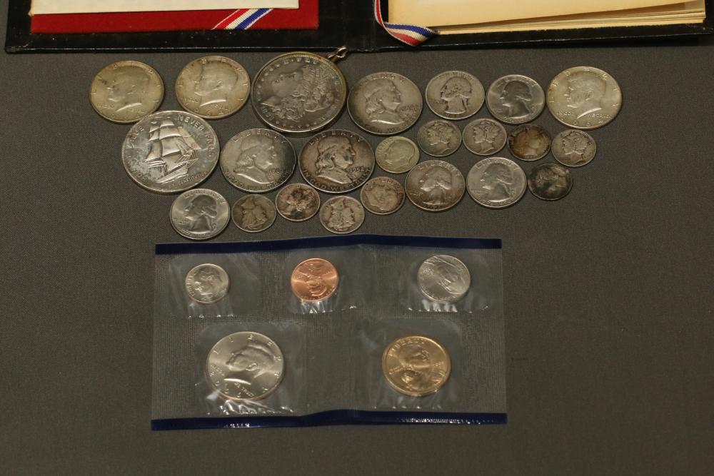 Silver coinage incl 6 half dollars dates incl 1952, 1954, 1962, 1964, ten dimes dates incl 1899, 1918, 1936, 1939, 1941, 1942, 1944, 1946, 1947, five quarters dates incl 1935, 1962, three Bicentennials, 1883 Morgan silver dollar with removable pendant ring, commemorative U.S. constitutional coin one troy ounce .999 fine silver, The official Bicentennial Day Commemorative Medal sterling silver proof coin, also incl 2006 Philadelphia mint set.