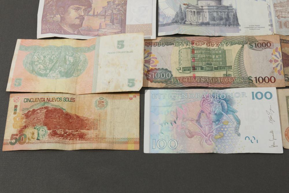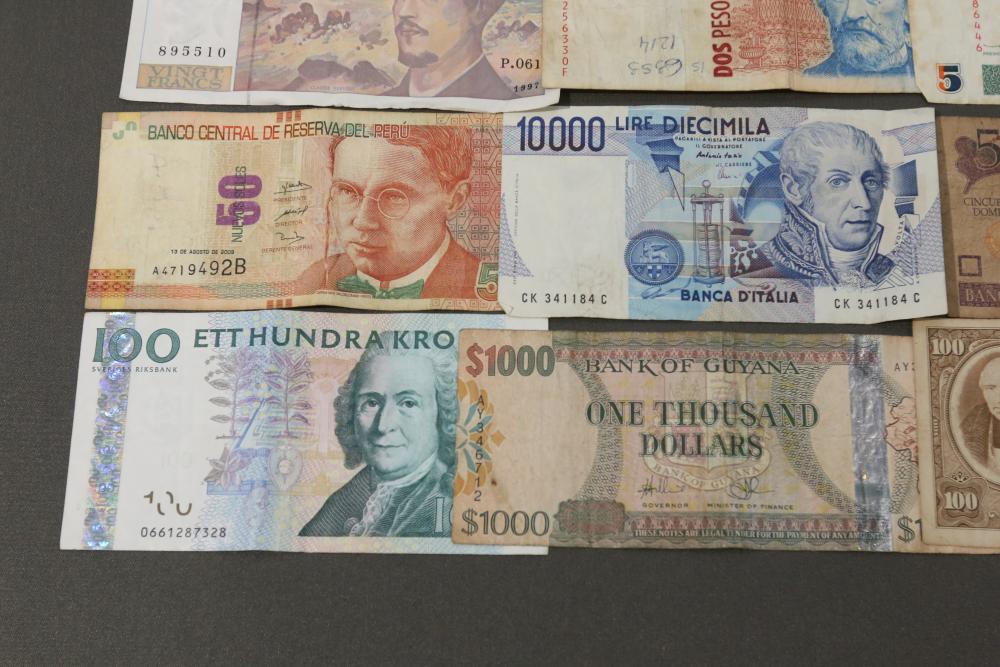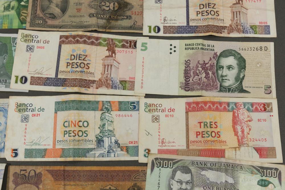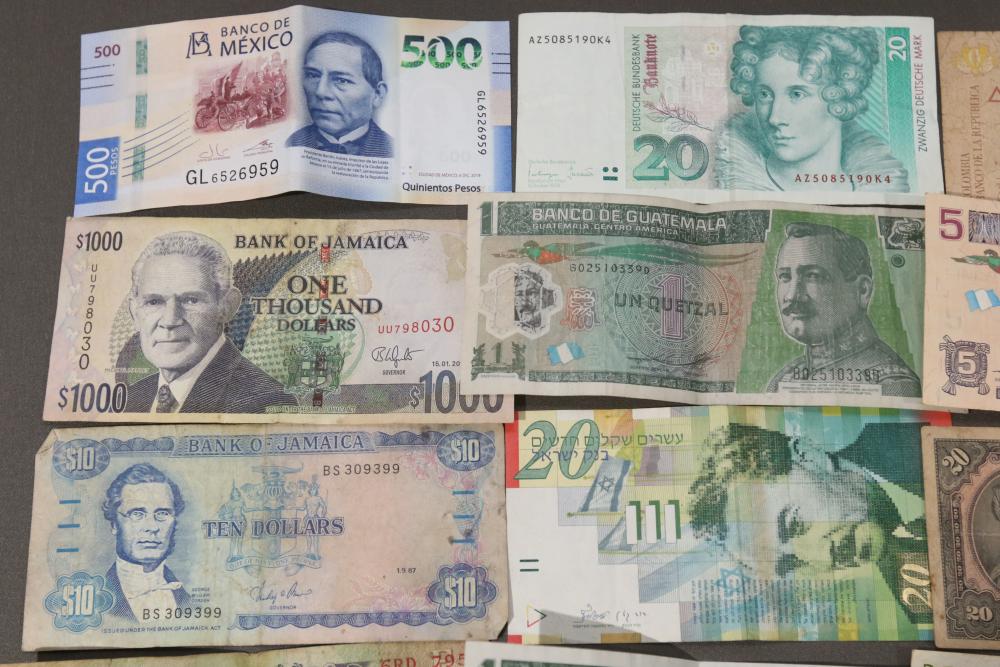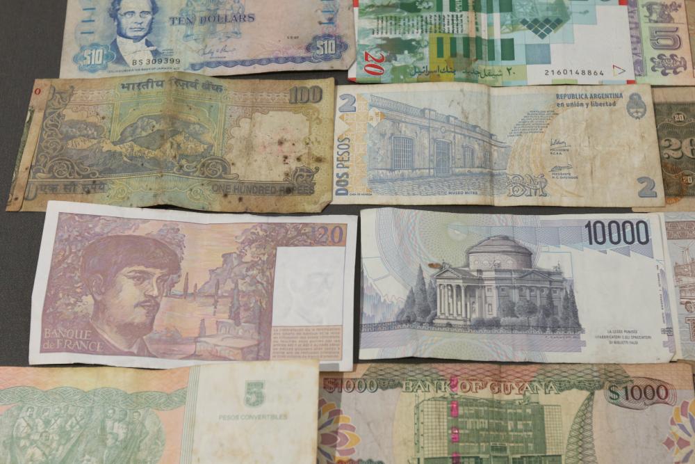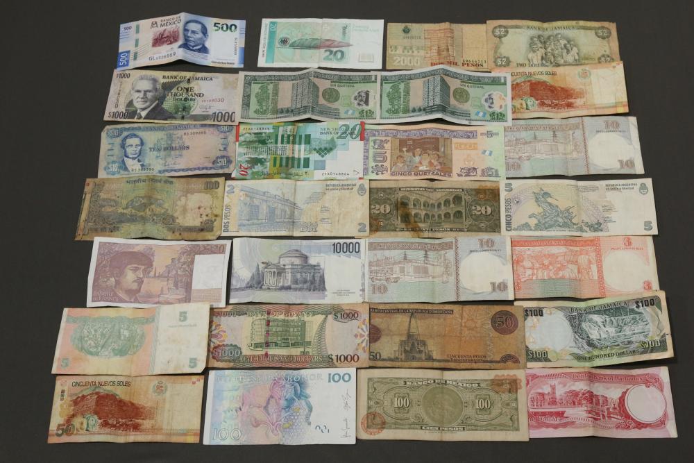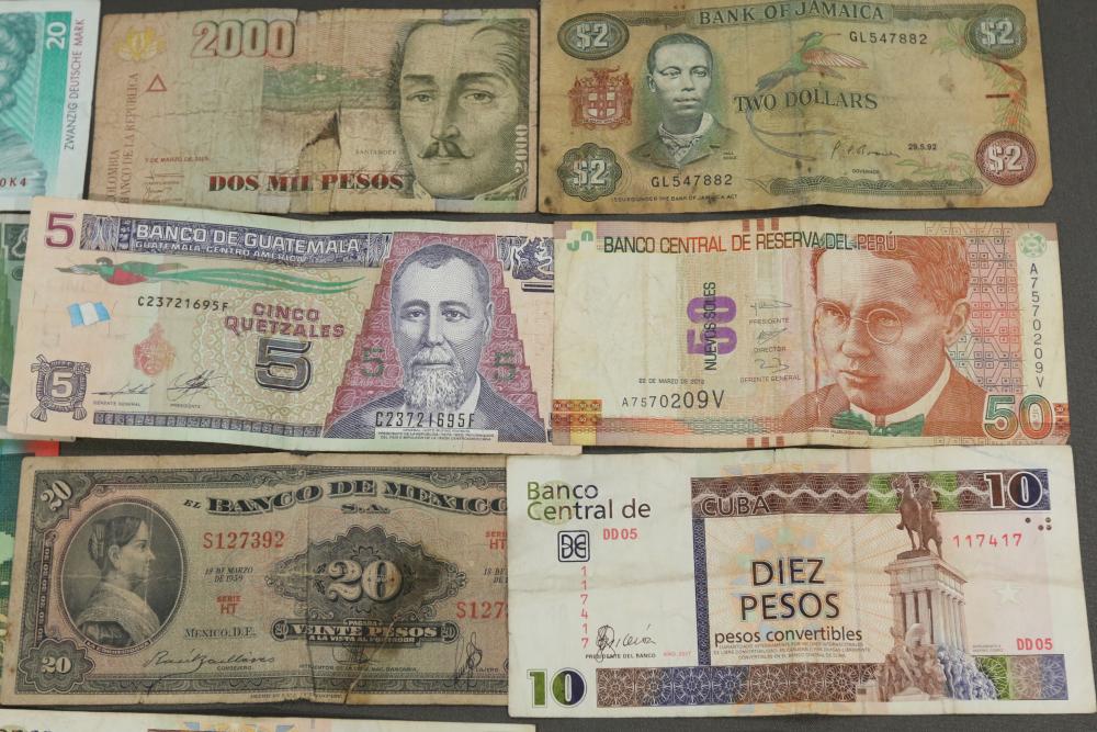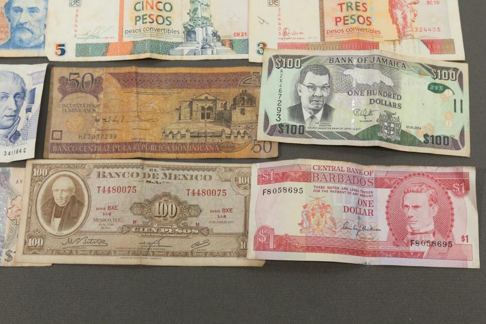 Foreign paper currency varying in country and denominations, some countries incl Guatemala, Honduras, Argentina, Mexico, Columbia, Israel, Barbados, Italy, Dominican Republic, Jamaica, Guyana, India, France, Peru, Cuba, Turkey, etc.