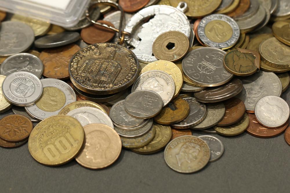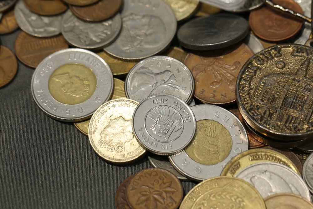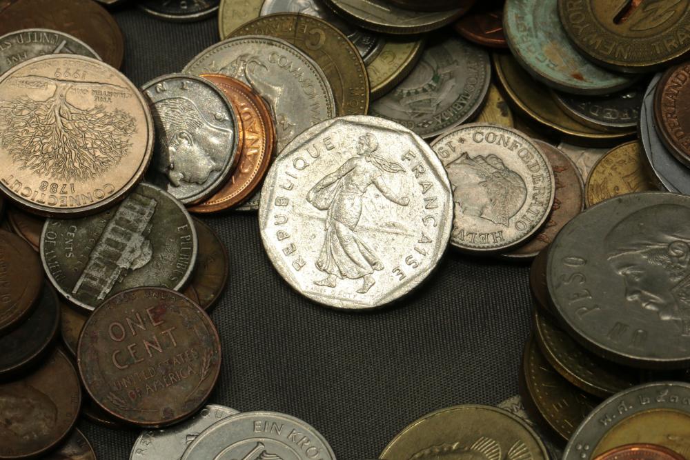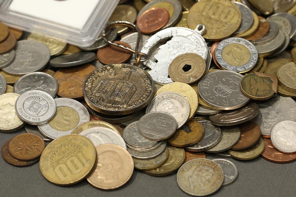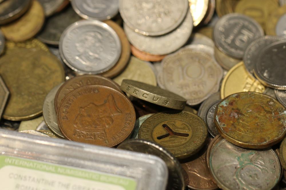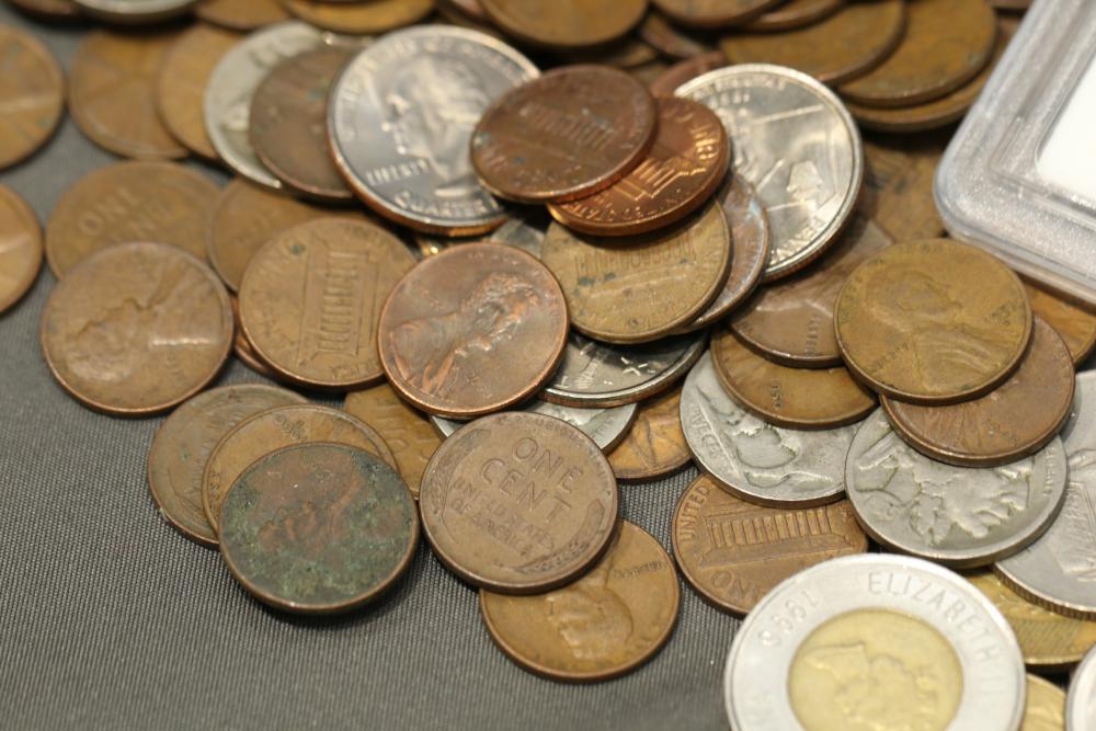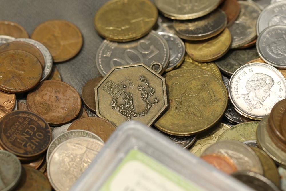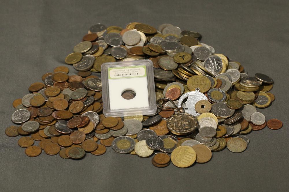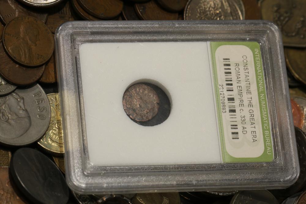 Domestic and foreign coinage incl slabbed "Constantine The Great Era Roman Empire c.330 AD" from International Numismatic Bureau, Domestic currency incl Lincoln pennies, wheat pennies, state quarters, buffalo nickels, foreign currency incl Columbia, Guatemala, France, Mexico, Canada, Hong Kong, Costa Rica, Peru, Denmark, etc, also incl tokens, and commemorative coins.