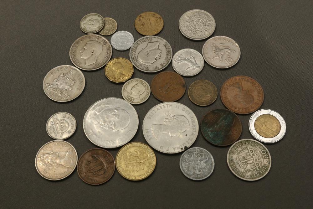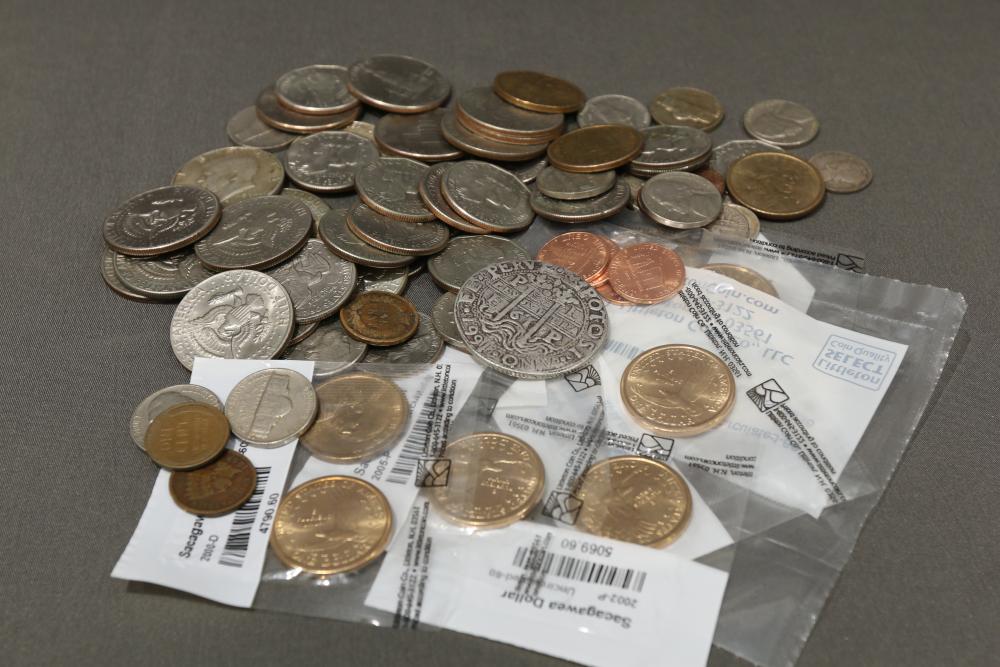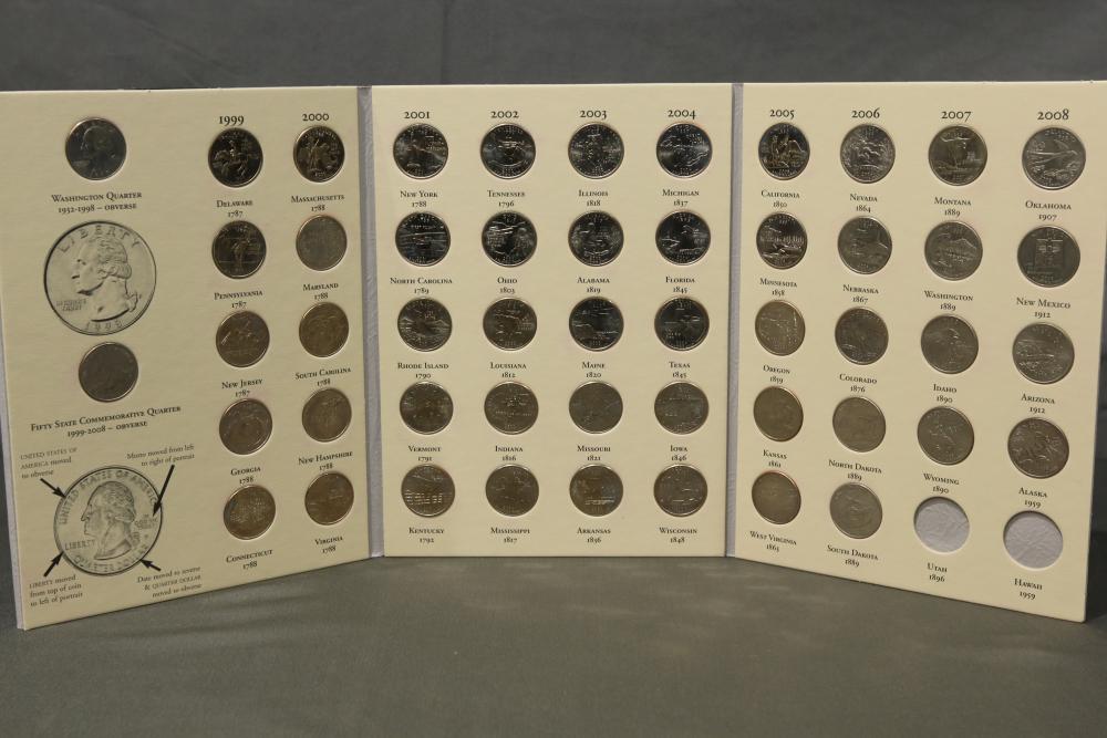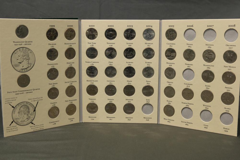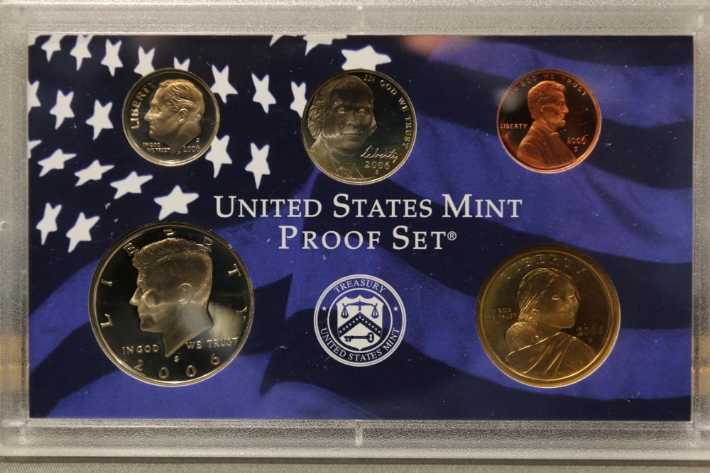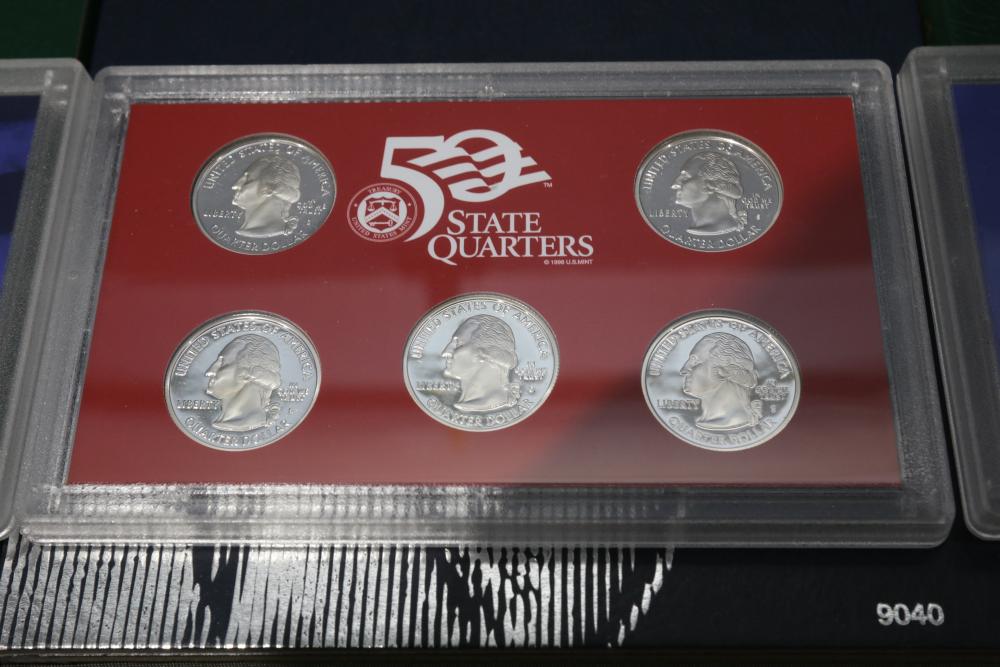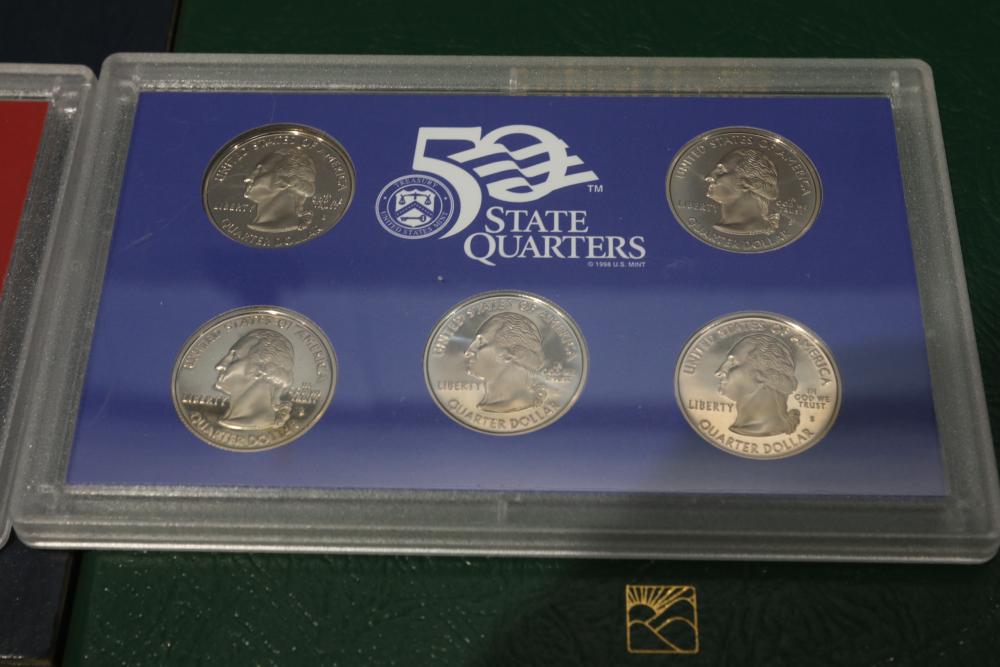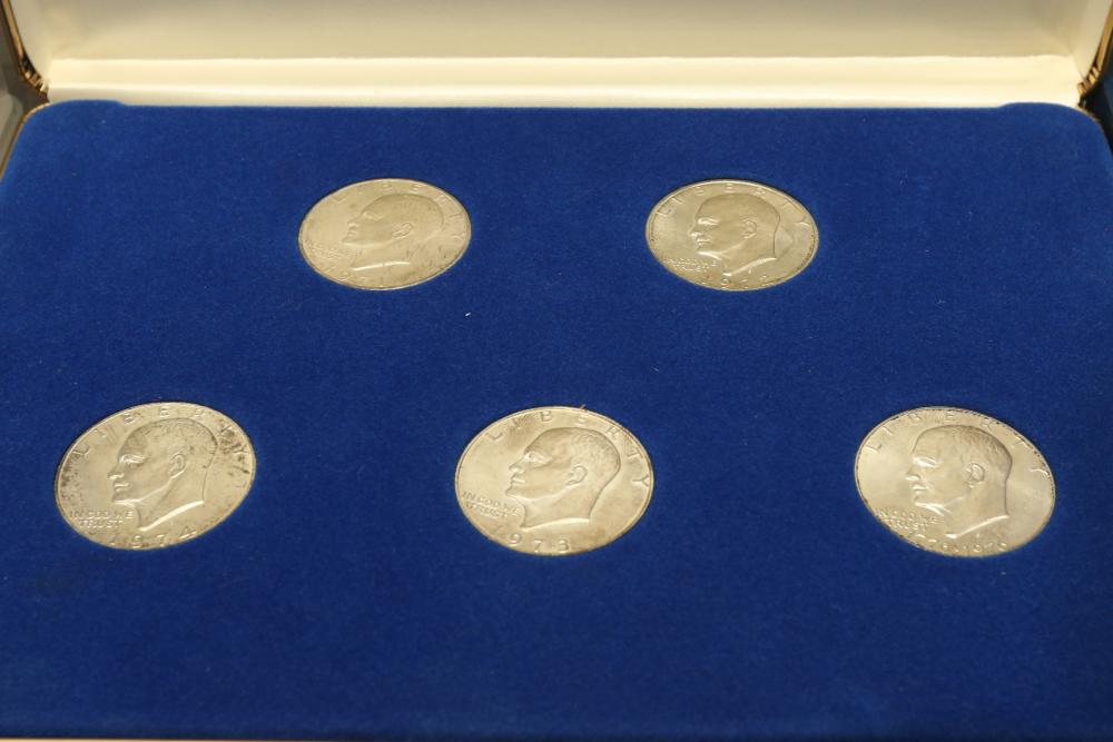 Domestic and foreign coinage incl five Eisenhower silver dollars, Kennedy half dollars three dated 1964, two Liberty Walking half dollars, six pre 1964 dimes, eleven 1979 half dollars, Ten Sacagawea gold coins, eight quarters three pre 1964, state quarters and Washington quarters in coin folders, four wheat pennies, two Indian head pennies, ten nickels, also incl 2006 proof sets commemorative coins, foreign currency, etc.