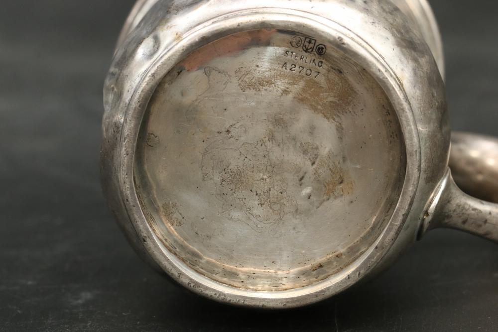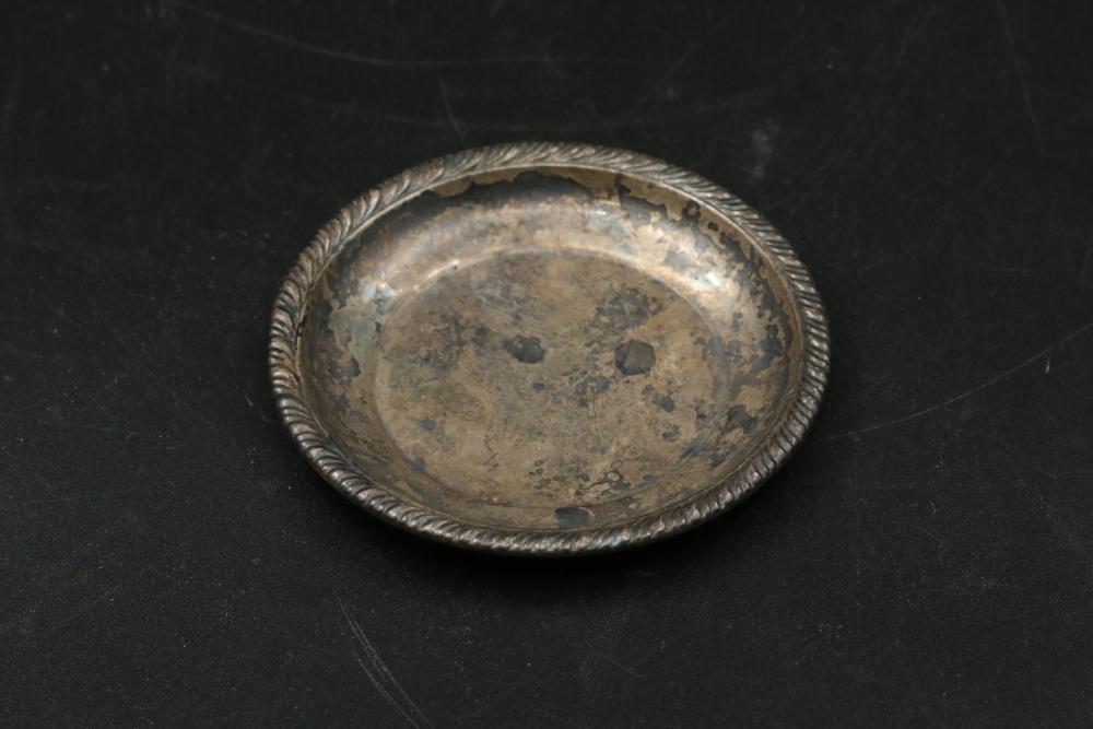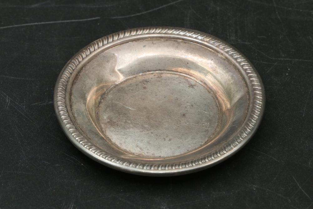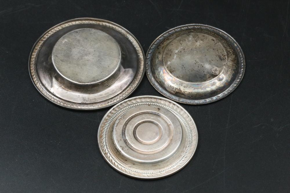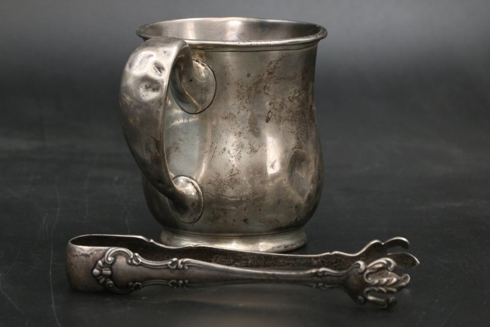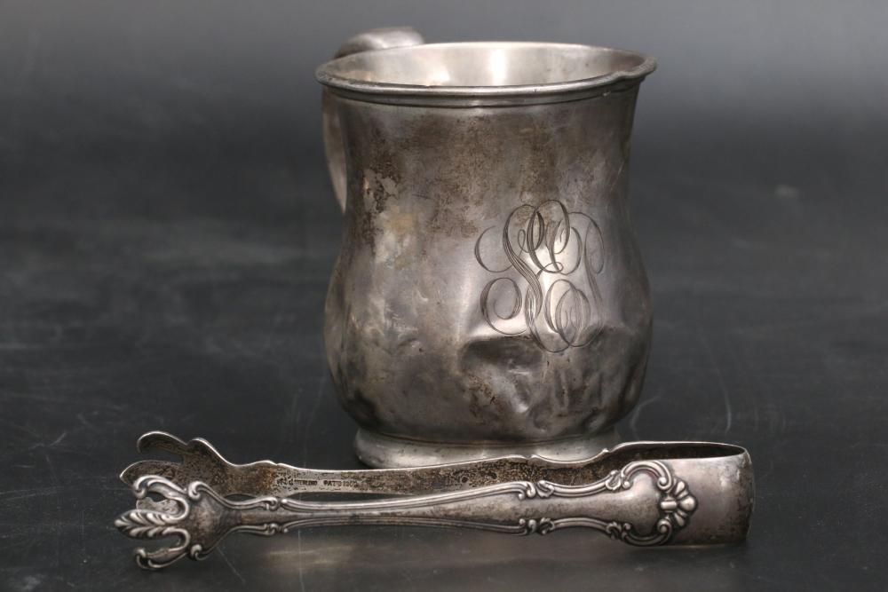 Sterling silver stamped items incl single handle cup, three small dishes, tongs, all marked "Sterling" total weight being 228 grams.
