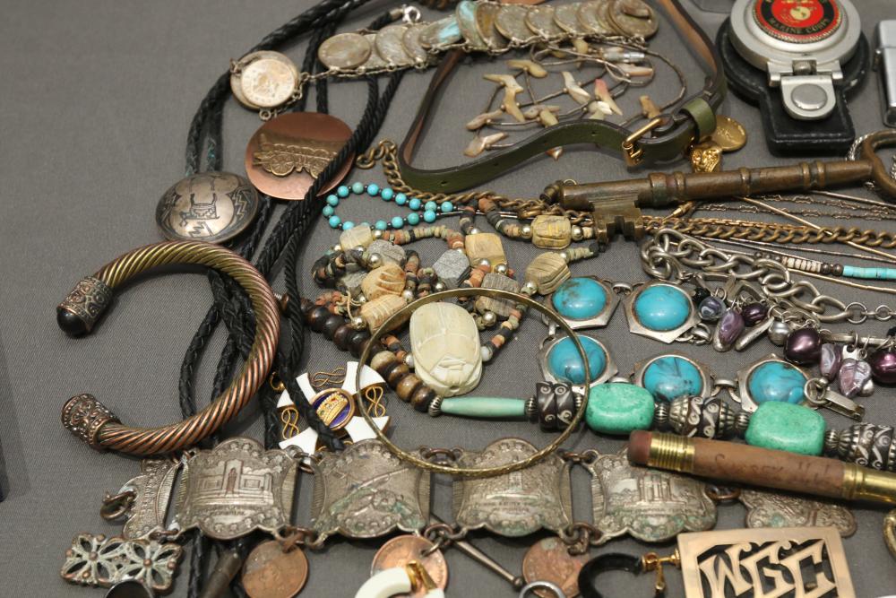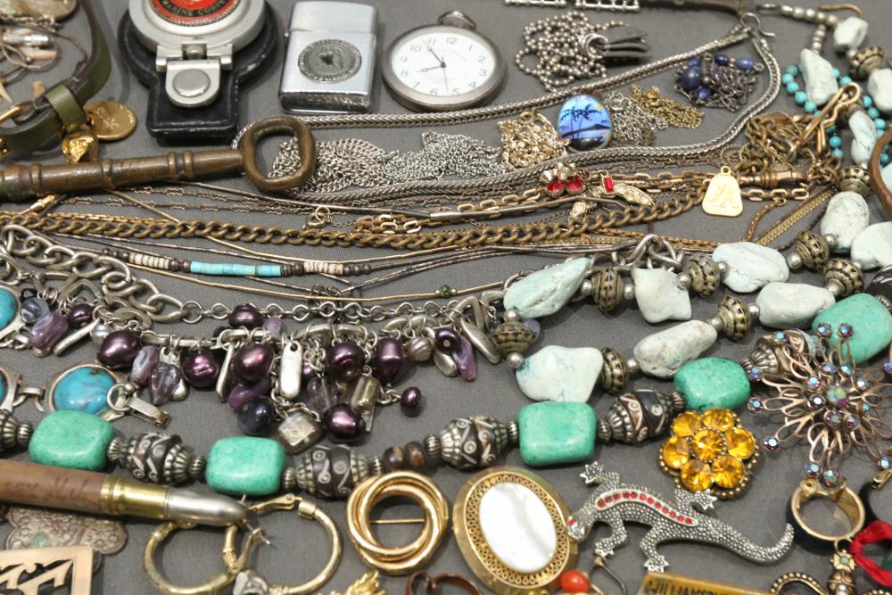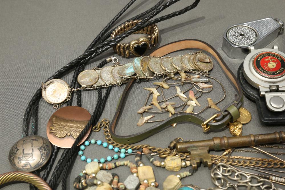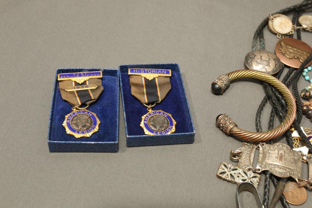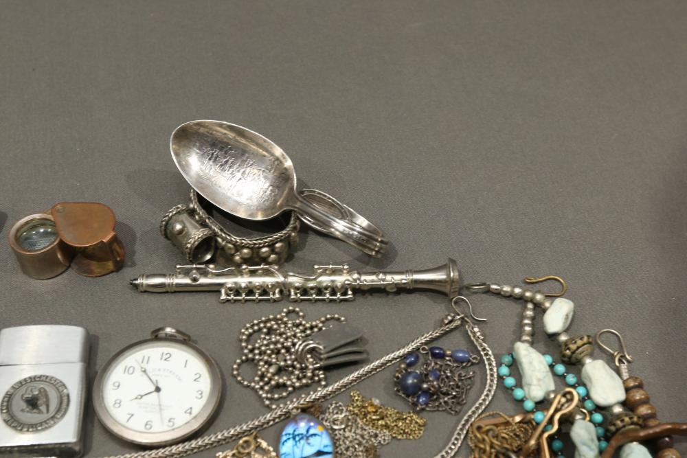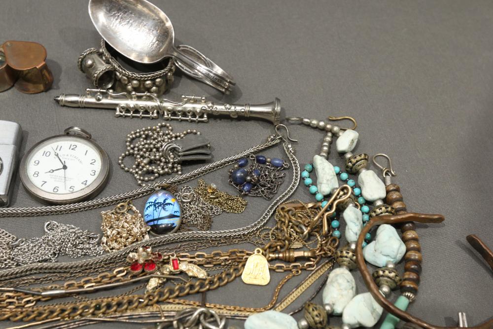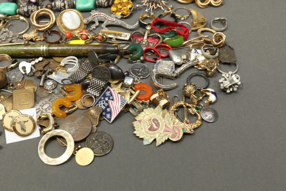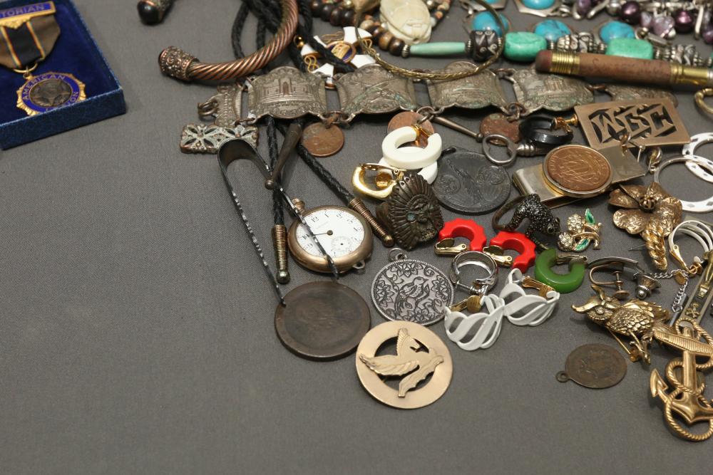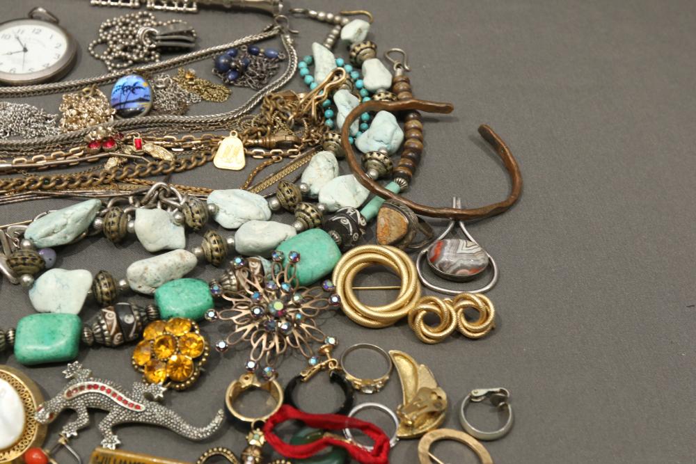 Costume jewelry incl necklaces, bracelets, rings, pins, earrings, pendants, display items, etc, also incl foreign coinage.