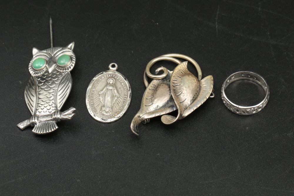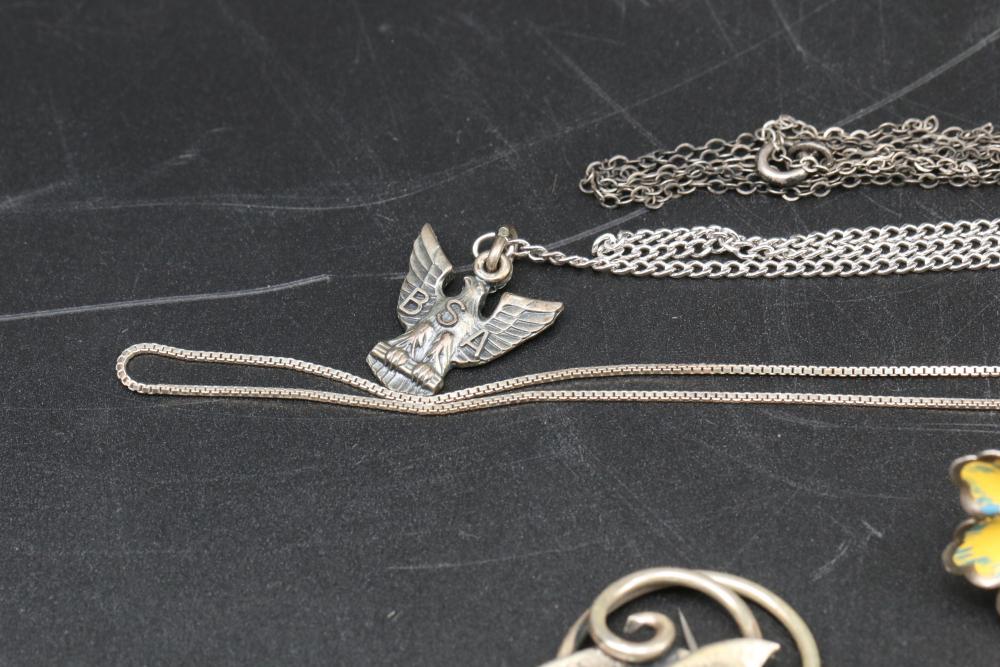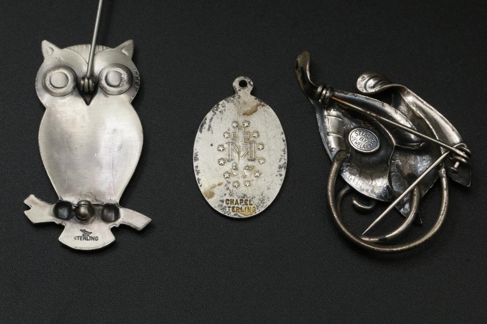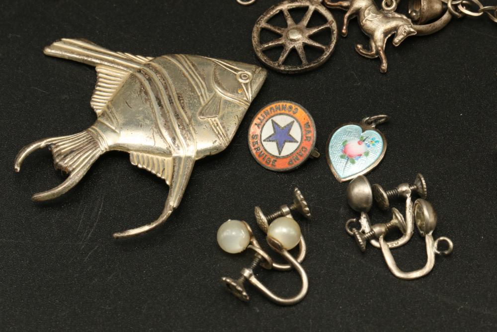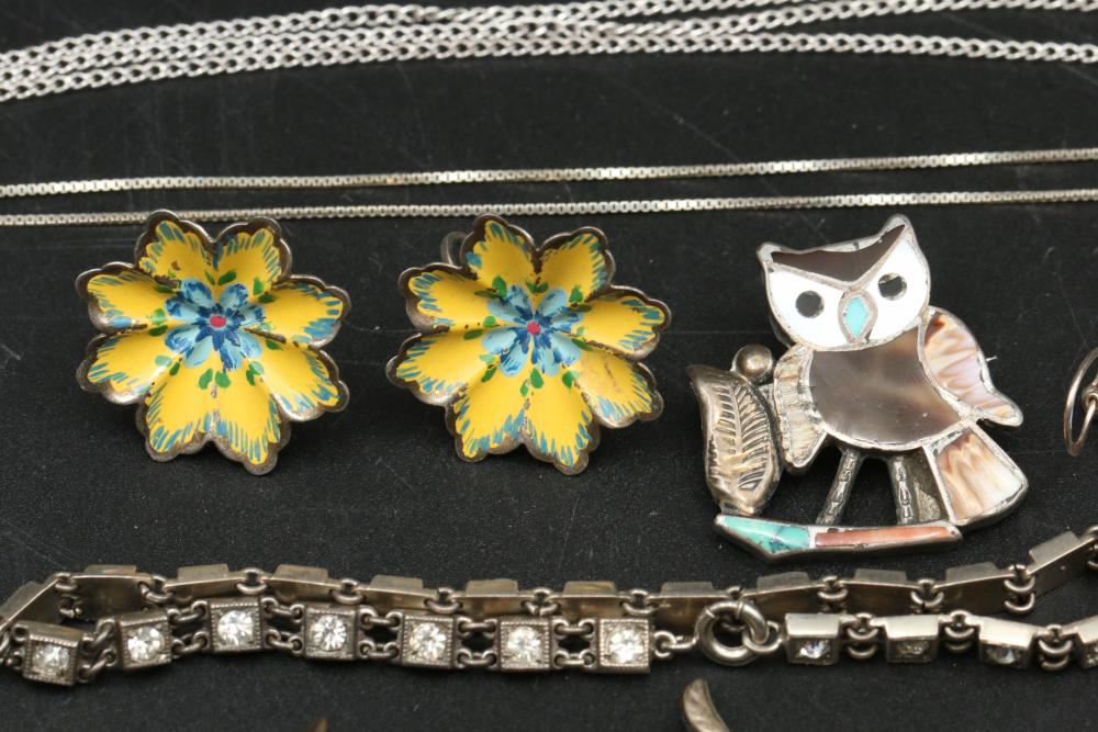 Gold and Sterling jewelry incl necklaces, bracelets, rings, pendants, earrings, pins, etc total weight of 14K being 6 grams, total weight of 10K being 3 grams, and total weight of sterling items being 100 grams.