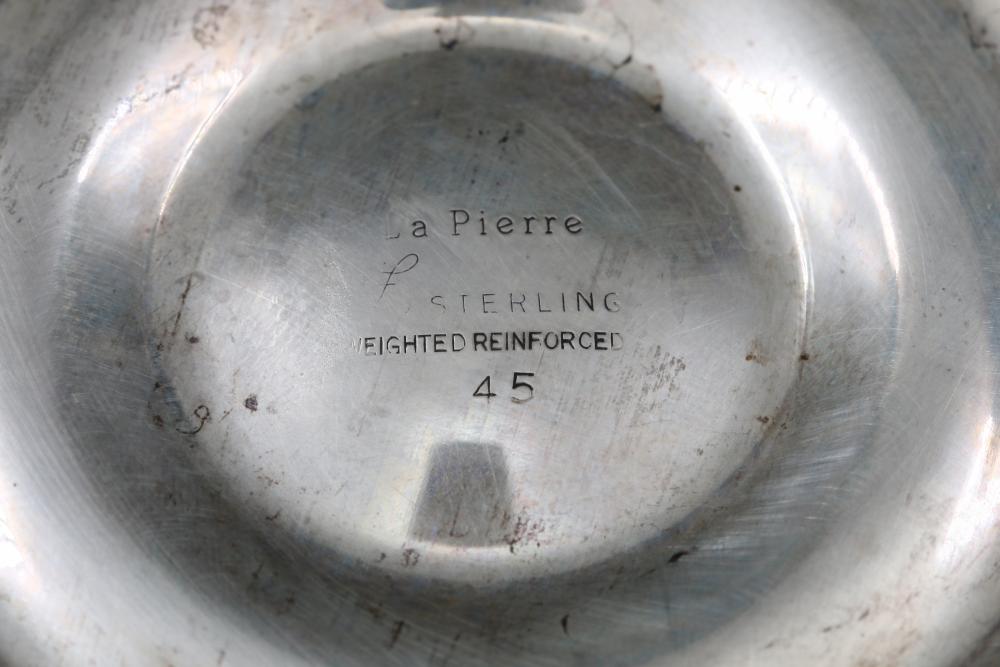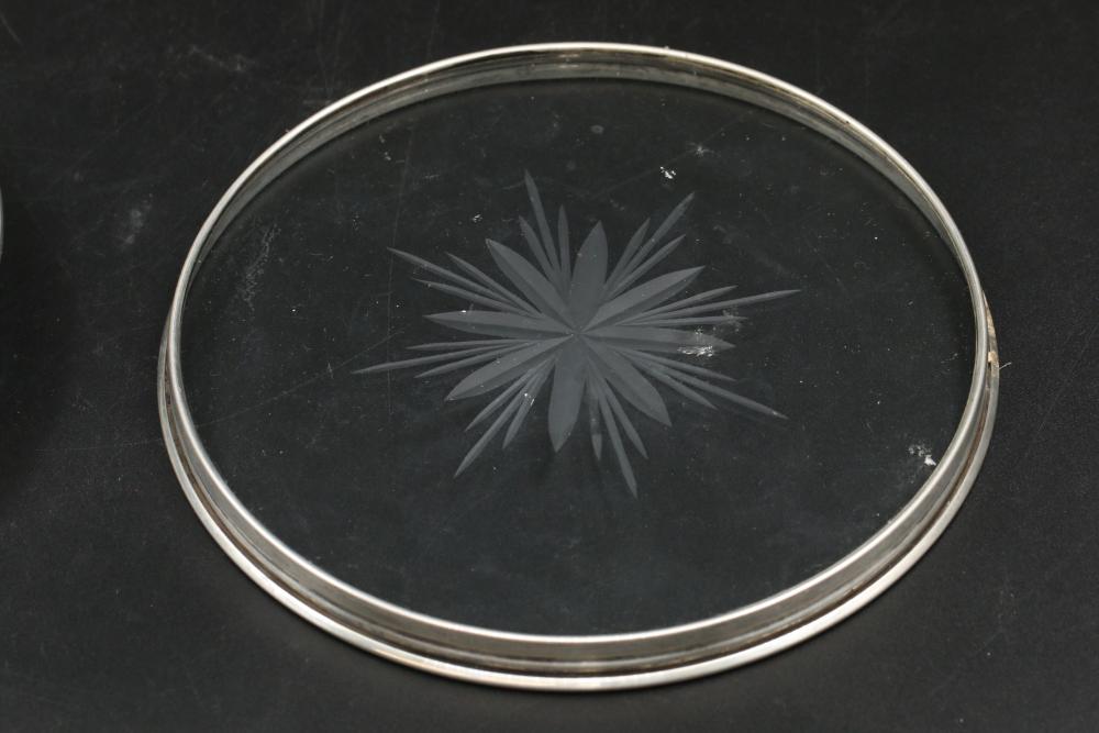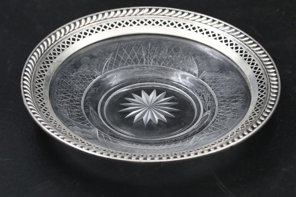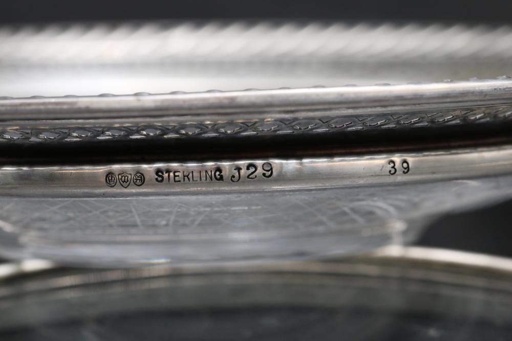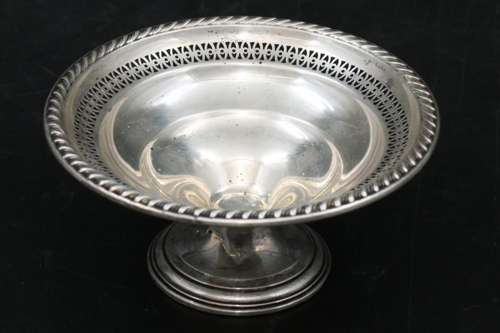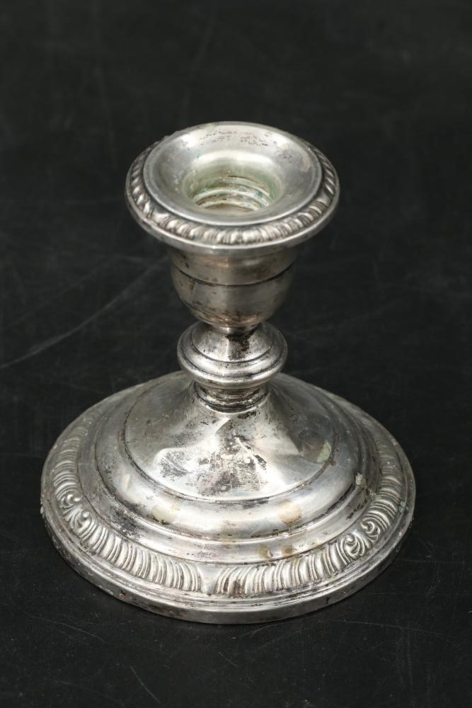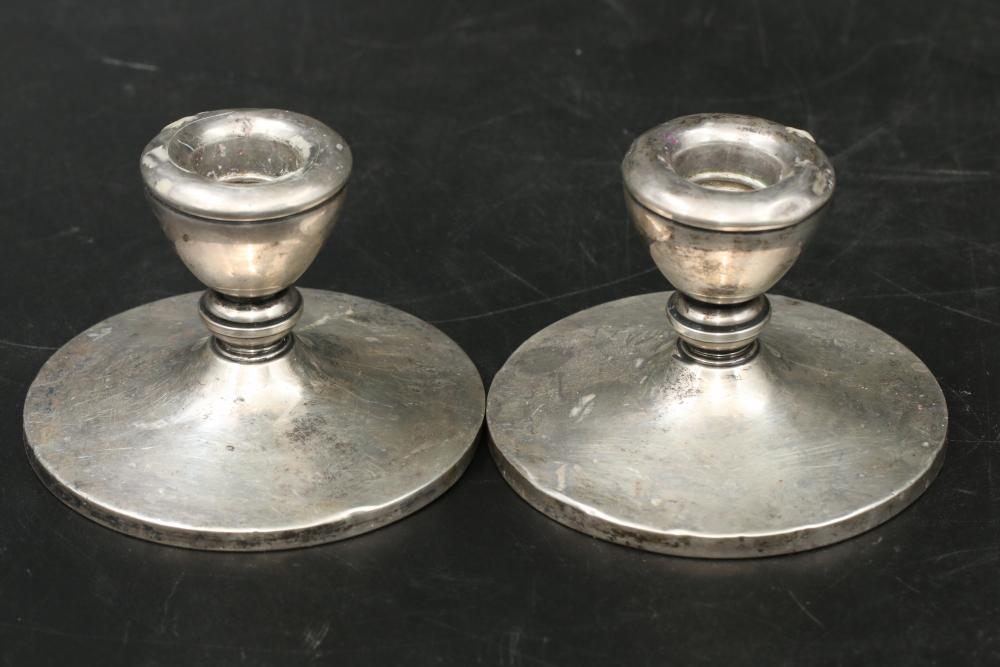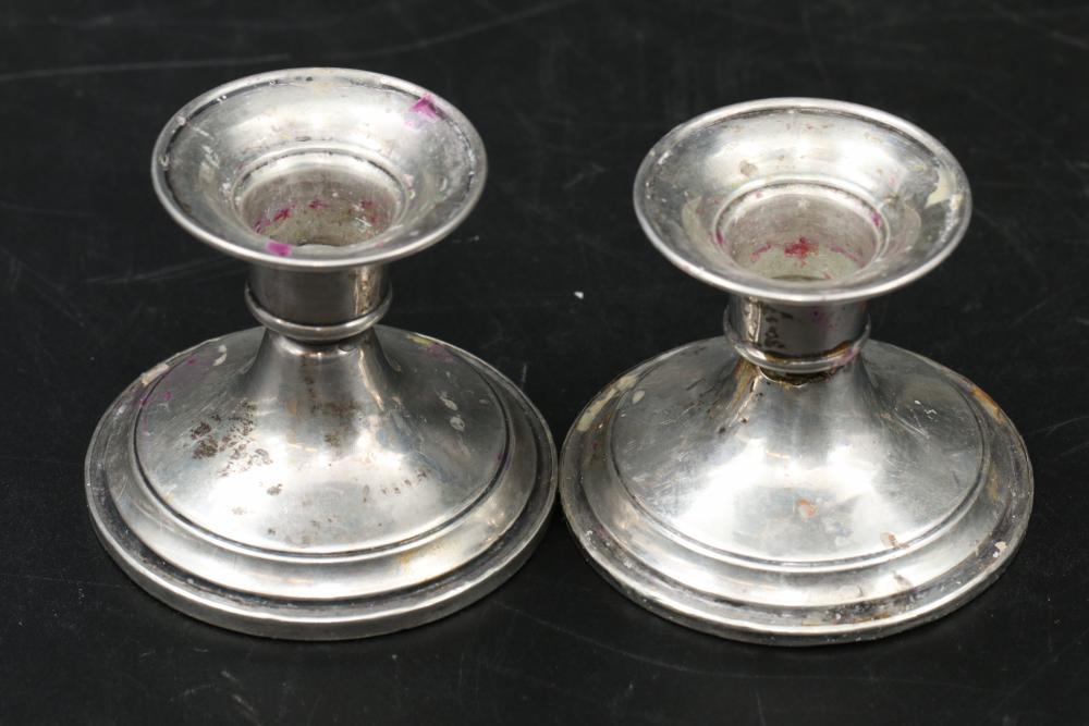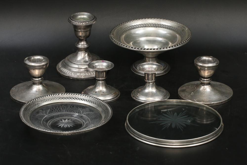 Sterling weighted items incl candlestick holders, raised dish with decorative rim, two sterling rimmed dishes, total weight of sterling weighted items being 1,390 grams.