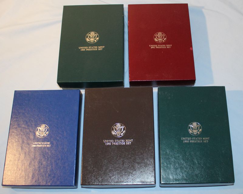 5 U.S. Mint Prestige coin sets including 1986, 1989, 1990, 1992 & 1995 with boxes and COAs.
