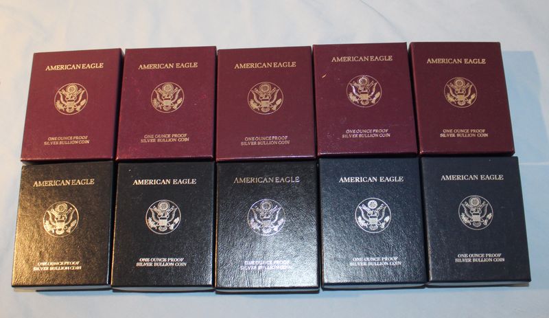 10 American Eagle one ounce proof silver bullion coins. Each coin is 99.9% silver. Dates include 1987, 1989, 1990, 1991, 1992, 1999, 1998, 2000, 2004, 2006.