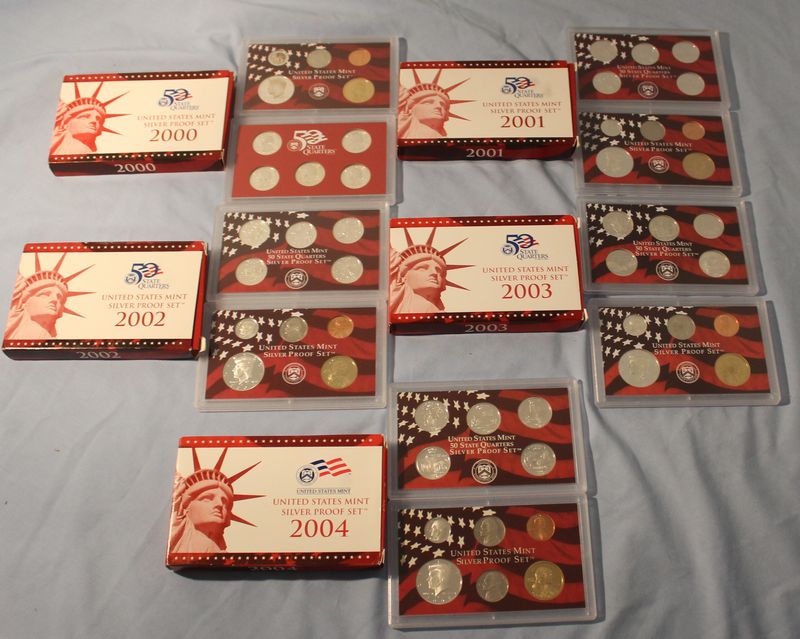 5 United States 50 State Quarters Mint Silver Proof Sets including 2000, 2001, 2002, 2003 & 2004.