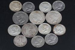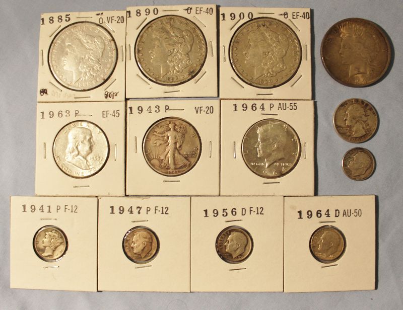 U.S. silver coins including 3 Morgan silver dollars (1885 O, 1890 O; 1900 O); a 1923 Peace Dollar; 1941 Walking Liberty half dollar; 1963 Franklin half dollar; 1964 Kennedy half dollar; 1954 Washington quarter; 5 dimes (all dated 1964 or earlier).