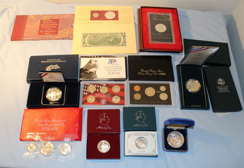 Collector coins and currency including the Thomas Jefferson Coinage and Currency Set; Eisenhower United States Proof Dollar; Lewis & Clark Bicentennial Silver Dollar; 2004 United States Mint 50 State Quarters Silver Proof Set; 1992 U.S. Mint Silver Proof Set; Eisenhower Centennial Silver Dollar; U.S. Bicentennial Silver Uncirculated Set; United States Mint George Washington Proof half dollar (90% silver); United States Mint George Washington uncirculated half dollar (36% silver); 1989 Chinese 1 oz .999 silver coin.