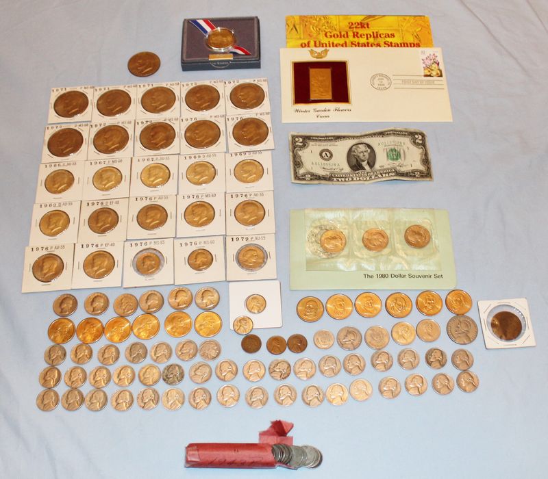 Coins and currency including 11 Eisenhower dollar coins; 12 Kennedy half dollars (1969 - 1979); 4 Susan B. Anthony dollars; 6 Sacagawea dollar coins; 6 Presidential dollar coins; a 1976 $2 bill; 41 vintage nickels; fifty-two 1943 steel pennies; 1991 Mt. Rushmore anniversary half dollar; misc. foreign coins