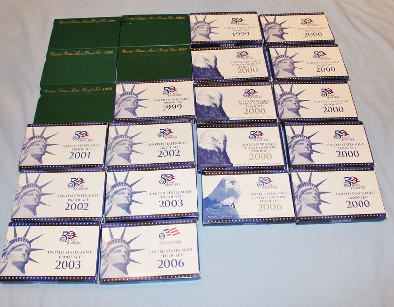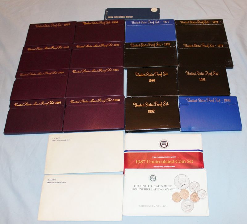 U.S. Mint coin sets including 1966 Special Mint Set; Proof Sets from 1971, 1973, 1976, 1977, 1980, 1981, 1982, 1983, 1985, 1986, 1989, 1990 (2), 1991, 1992, 1993; Uncirculated sets from 1980, 1981, 1987, 1989.