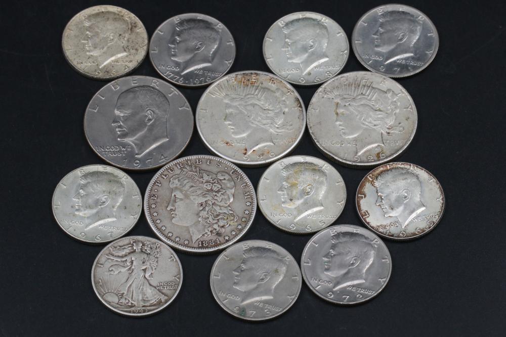U.S. Currency incl half and silver dollar coins incl 1884 Morgan, x2 1926 Peace dollar, 1974 Eisenhower, Walking Liberty Half dollar 1943, Kennedy halfs years incl 1964, 1965, 1967, 1968, 1971, 1972, 1973.