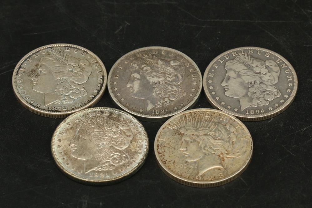 Five silver dollars incl four Morgans dates incl 1878, 1889-O, 1894-O, 1921, also incl one Peace dollar 1923.