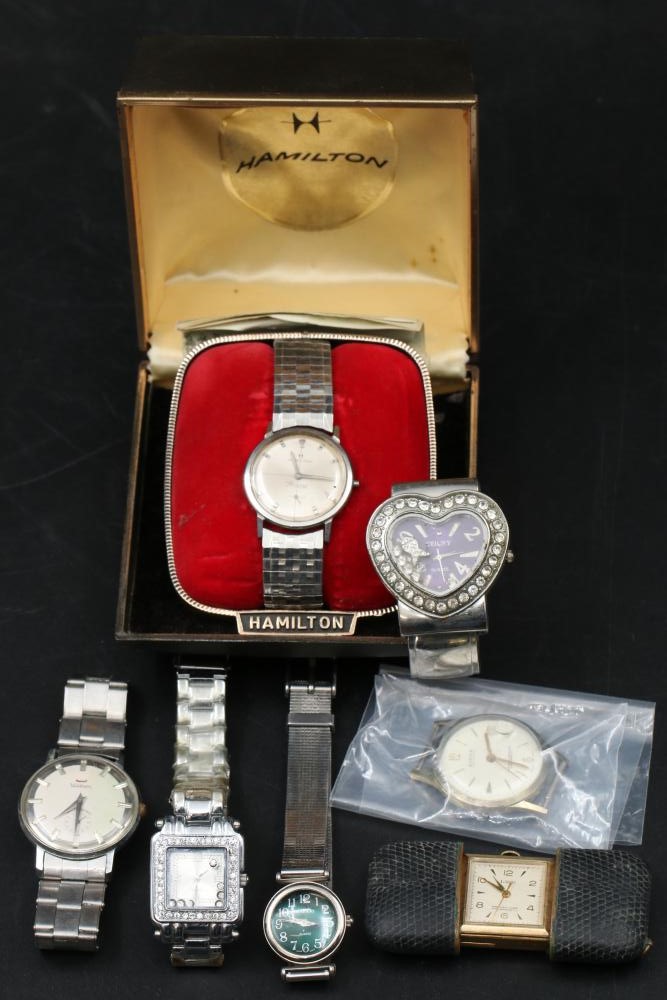 Various wrist watches some brands incl Hamilton Thin Line, Rumours, Manson Calendar, Waltham, etc, also incl Laco pocket clock.
