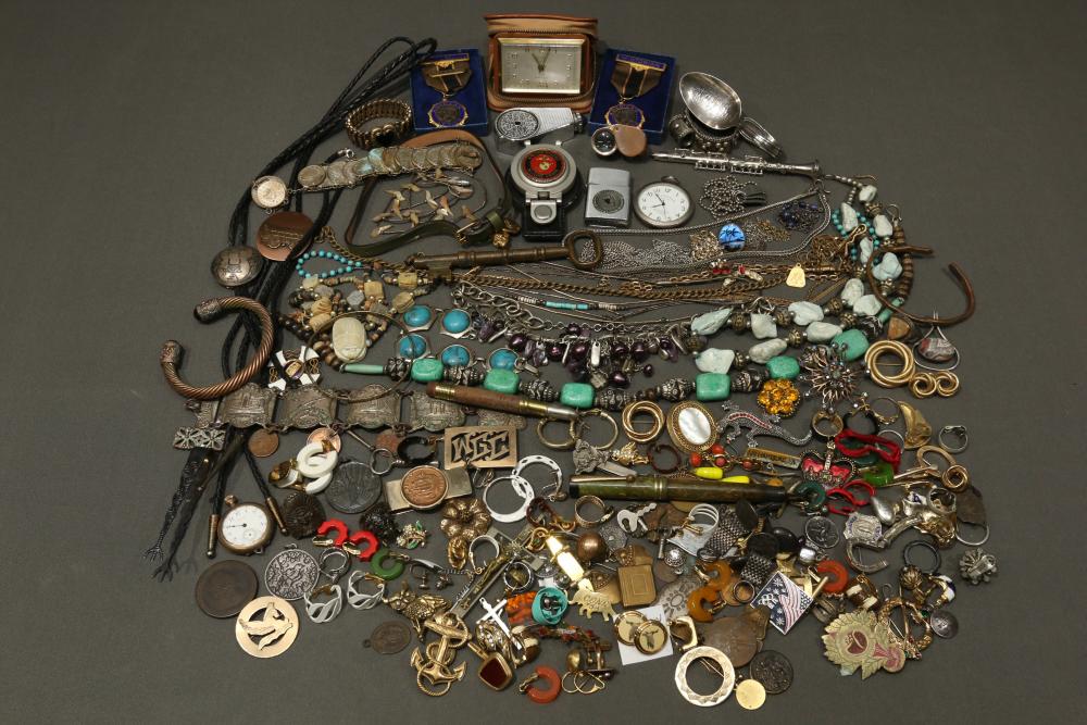 Costume jewelry incl necklaces, bracelets, rings, pins, earrings, pendants, display items, etc, also incl foreign coinage.