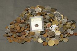 Domestic and foreign coinage incl slabbed "Constantine The Great Era Roman Empire c.330 AD" from International Numismatic Bureau, Domestic currency incl Lincoln pennies, wheat pennies, state quarters, buffalo nickels, foreign currency incl Columbia, Guatemala, France, Mexico, Canada, Hong Kong, Costa Rica, Peru, Denmark, etc, also incl tokens, and commemorative coins.