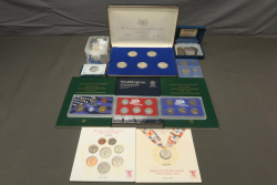 Domestic and foreign coinage incl five Eisenhower silver dollars, Kennedy half dollars three dated 1964, two Liberty Walking half dollars, six pre 1964 dimes, eleven 1979 half dollars, Ten Sacagawea gold coins, eight quarters three pre 1964, state quarters and Washington quarters in coin folders, four wheat pennies, two Indian head pennies, ten nickels, also incl 2006 proof sets commemorative coins, foreign currency, etc.