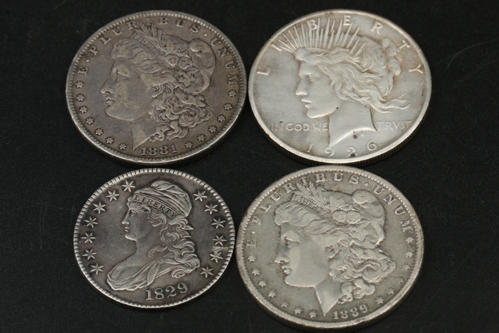 Four U.S. coins incl two Morgan silver dollars dated 1881 and 1889, one Peace dollar coin dated 1926-S, and one Capped bust half dollar dated 1829.