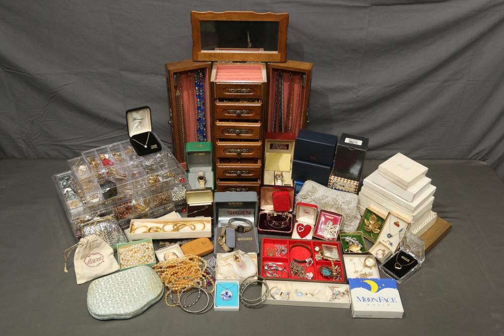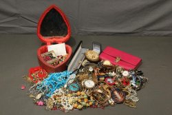 Costume jewelry incl necklaces rings, earrings, bracelets, pins, broaches, pendants, wrist and pocket washed, beads, foreign currency, tokens, etc.
