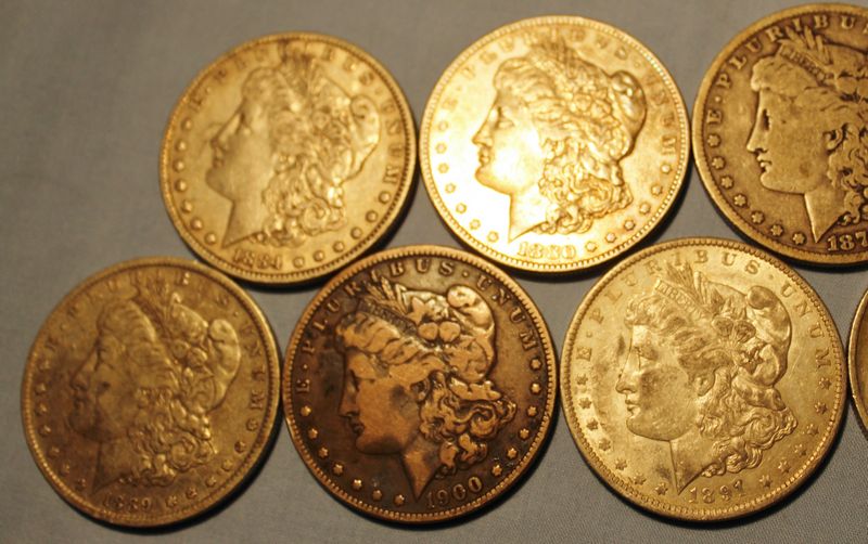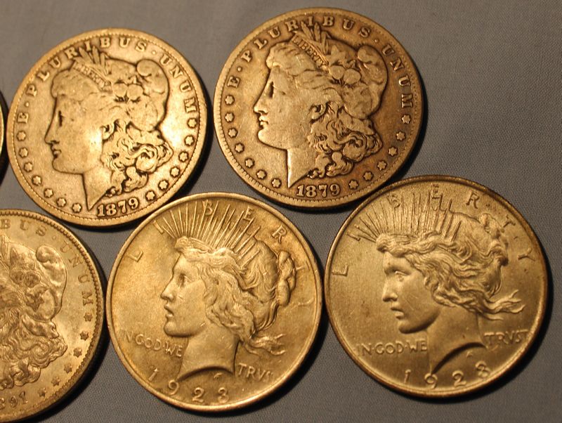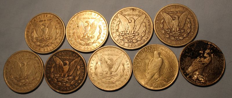 7 Morgan and 2 Peace U.S. Silver Dollars including an 1879 O; an 1879; an 1880; an 1884; an 1889 O; a 1900 O; an 1891 O; two 1923 Peace Dollars (one mark obscured). Shipping is available for this item.