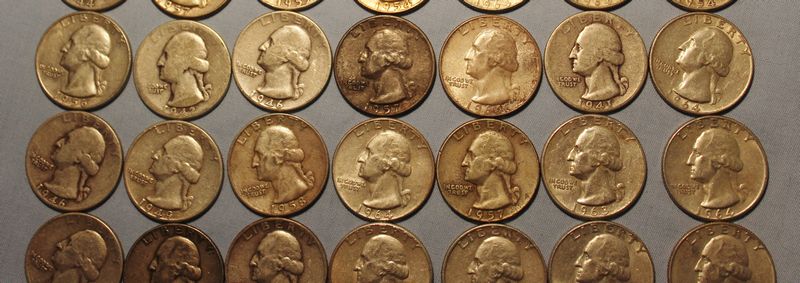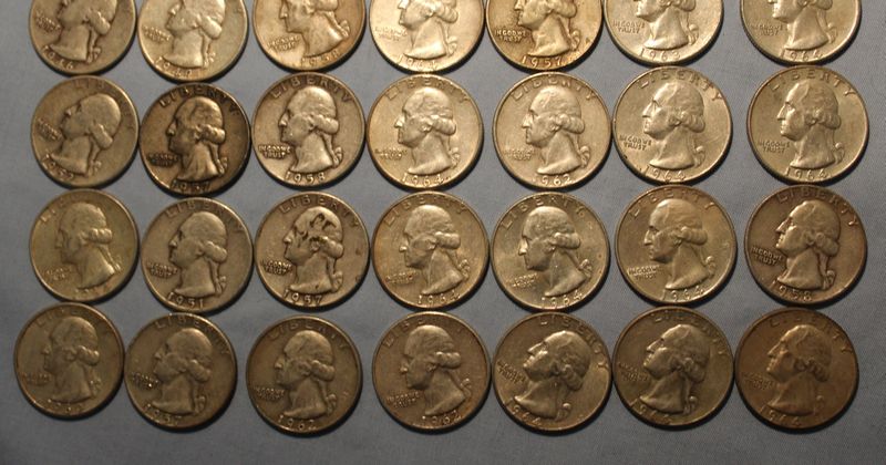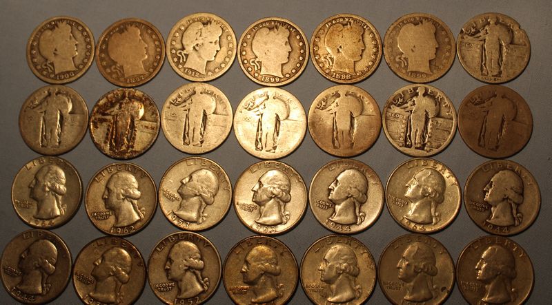 63 silver U.S. quarters (all dated pre 1965) including 6 Barber quarters; 8 Liberty quarters (very worn); 49 Washngton quarters (various dates, unsorted). Shipping is available for this item.
