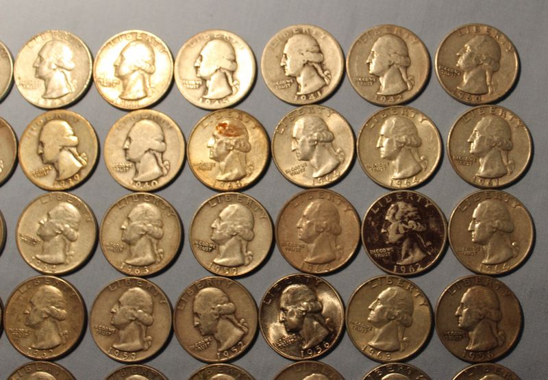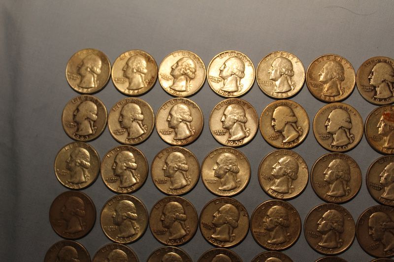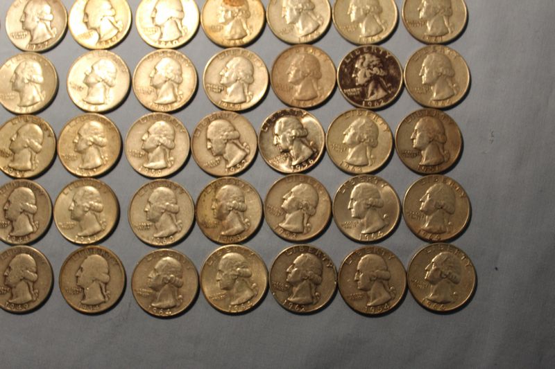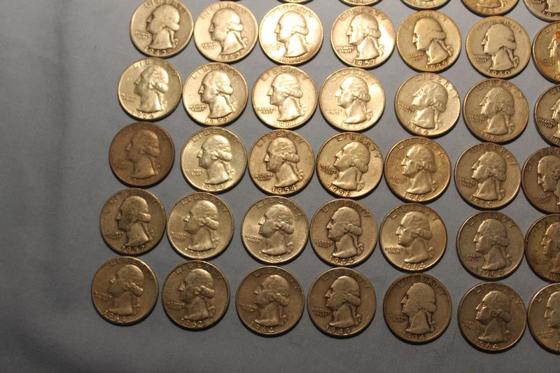 60 silver U.S. Washington quarters (all pre 1965, various dates, unsorted). Shipping is available for this item.