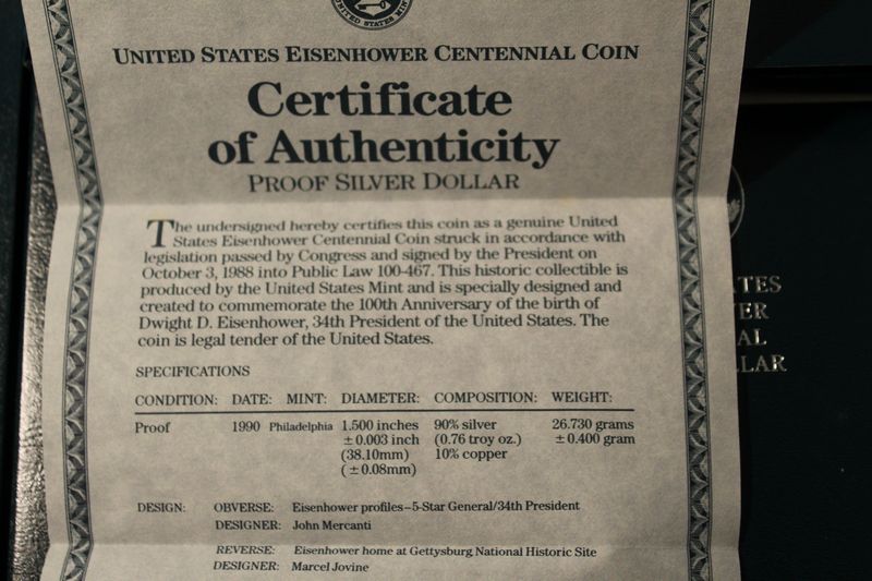 10 Eisenhower Centennial Silver Dollar Proof coins with boxes and COAs. Each coin is 90% silver and weighs .76 troy oz. Shipping is available for this item.