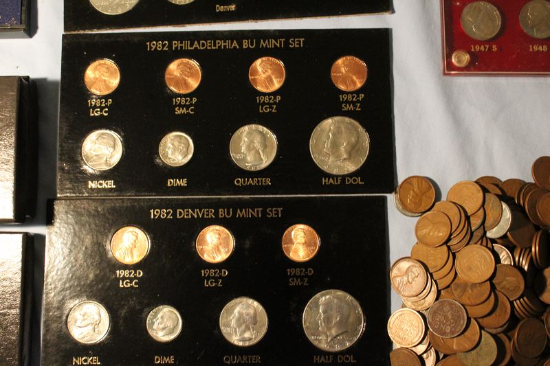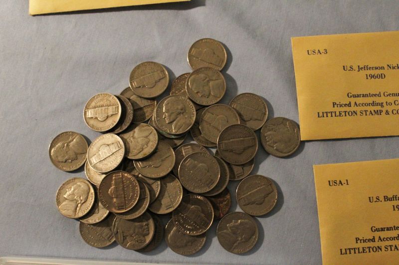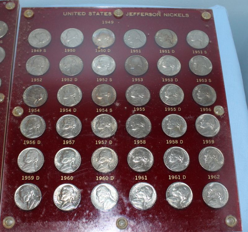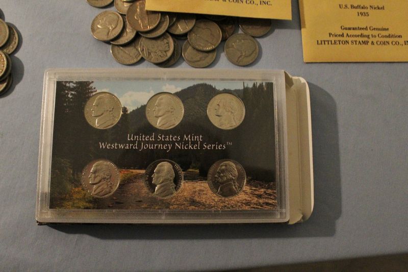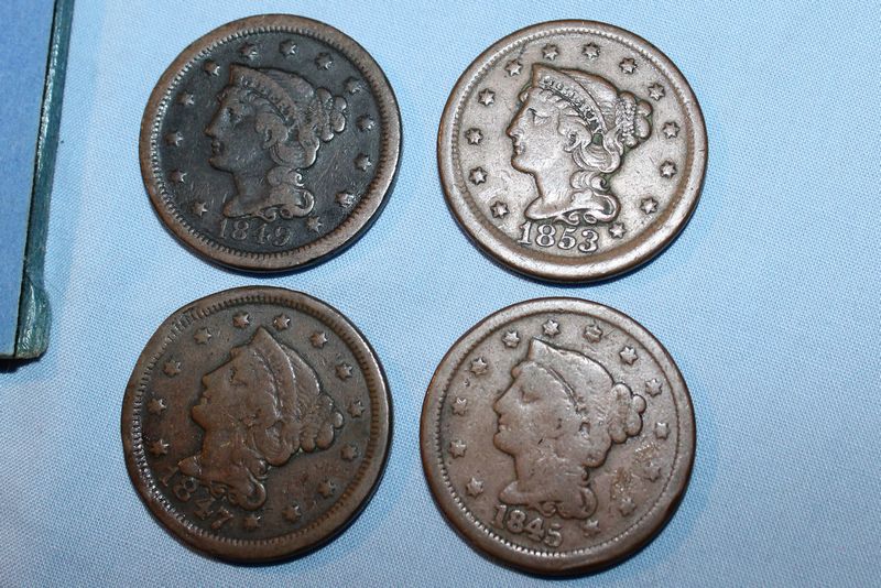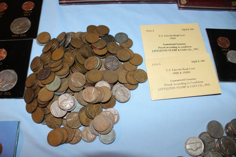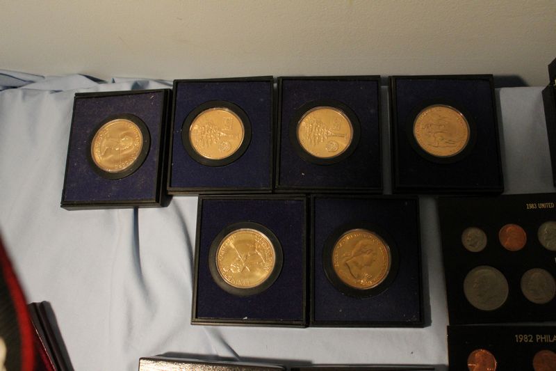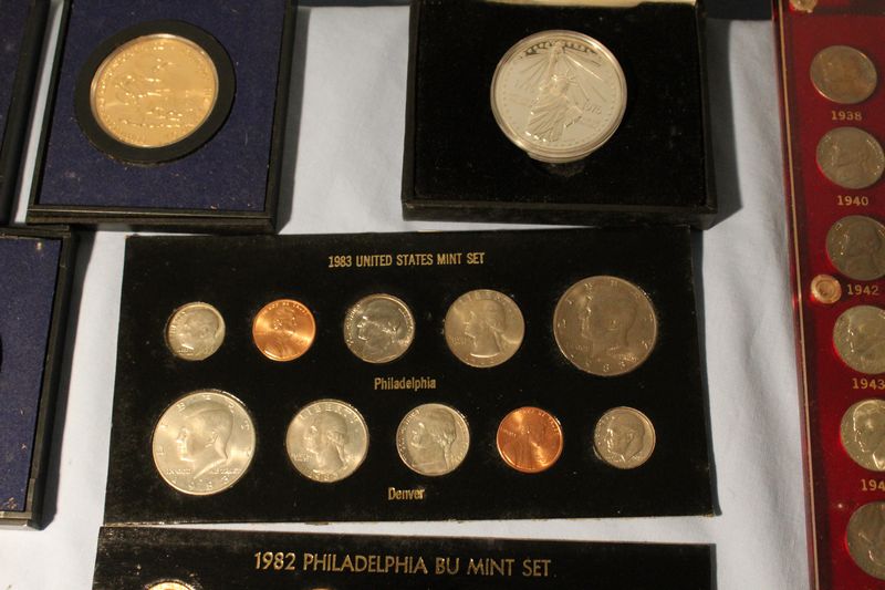 Coins and medals including 4 antique US one cent coins dated 1845, 1847, 1849 & 1853; 30 Barber Nickels (various dates unsorted); 53 Indian Head pennies (various dates, some sorted); 230 wheat back pennies (various dates unsorted); Jefferson Nickel collection 1938 - 1962; 45 loose vintage nickels (unsorted); 7 US Mint 1989 Congressional Coins half dollar proofs; 1992 U.S. Olympic half dollar proof; two 1982 US Mint coin sets; a 1983 U.S. Mint coin set; a 1982 Lincoln Cents set; 2004 US Mint Westward Journey Nickel Series; The National Bicentennial Medal and 6 other Bicentennial Medals.