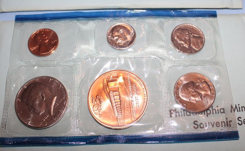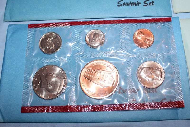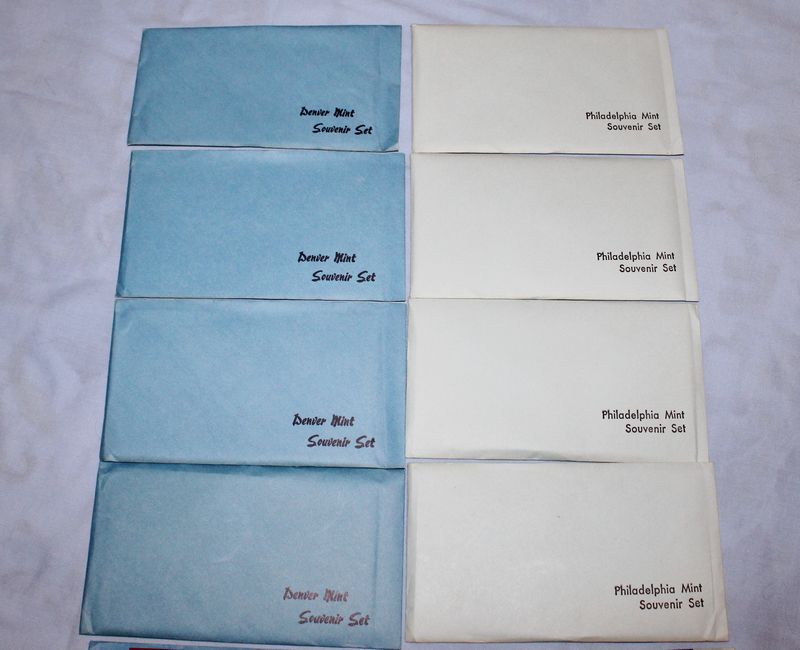 1984 Mint Souvenir Coin Sets, five from the Denver Mint and five from the Philadelphia Mint, with envelopes (all open).
