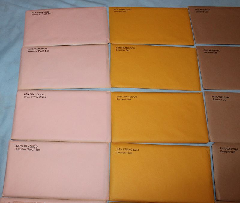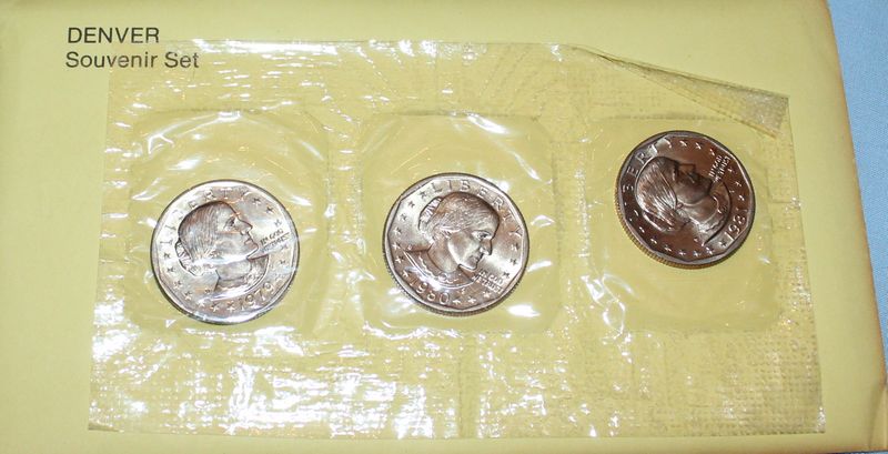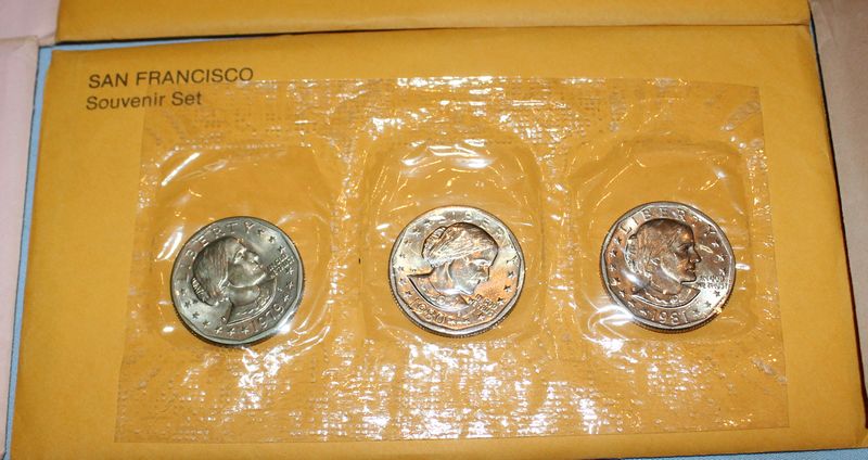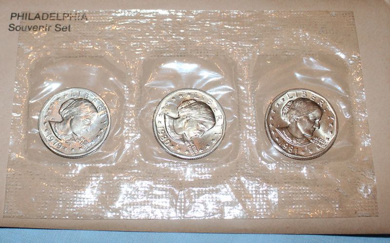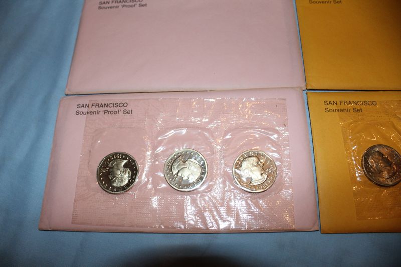 20 Mint Souvenir Sets of Susan B. Anthony coins. Each set contains coins from 1979, 1980 and 1981. Included are 5 San Francisco Souvenir "Proof" sets in pink enevelopes; 5 San Francisco Souvenir Sets in orange envelopes; 5 Philadelphia Souvenir Sets; 5 Denver Souvenir Sets (one envelope torn).