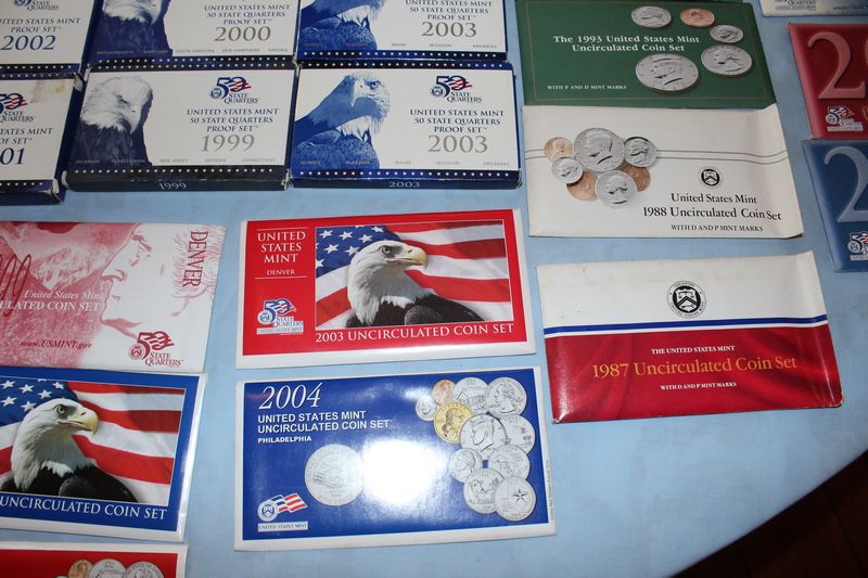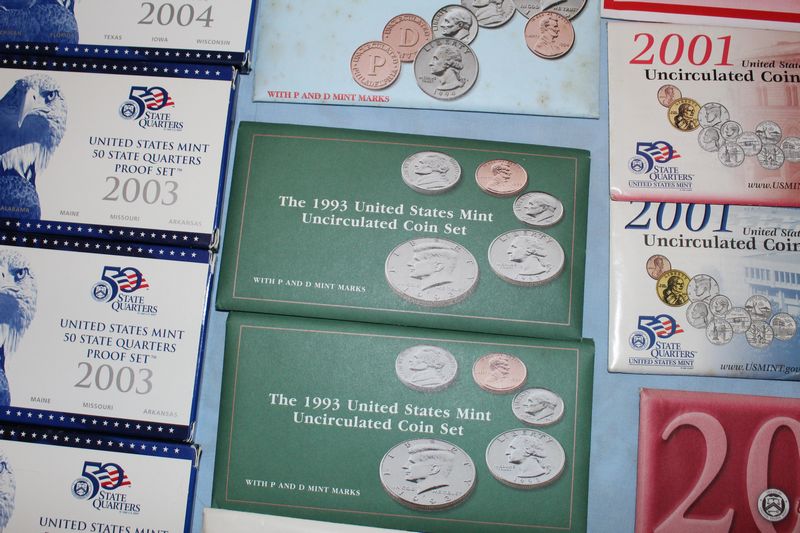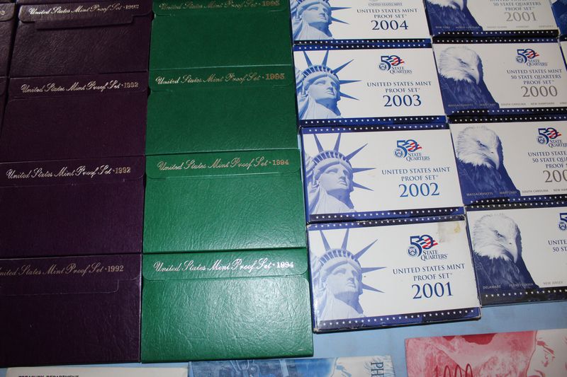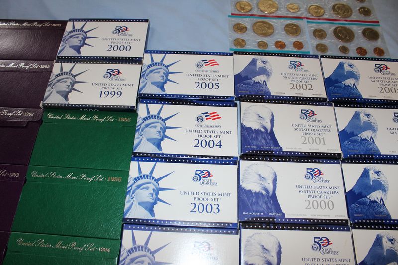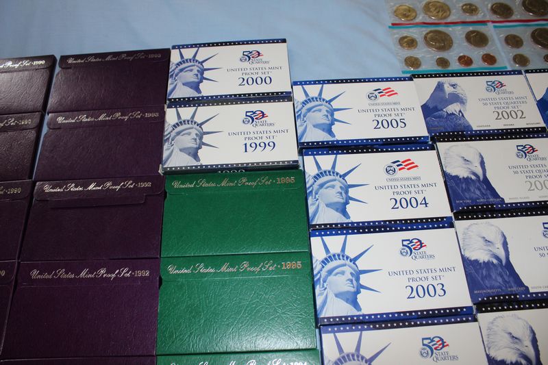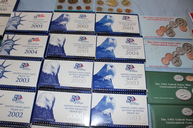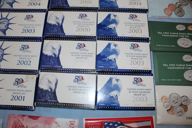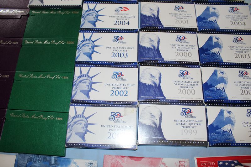 U.S. Mint Proof Sets including six 1990; six 1992; two 1992; two 1995; one 1999; one each 2000 - 2005. Also with this lot are ten U.S. Mint 50 State Quarters Proof Sets (see photos); two 1968 Uncirculated Sets; numerous other Uncirculated Coin Sets from 1987 to 2004; etc.