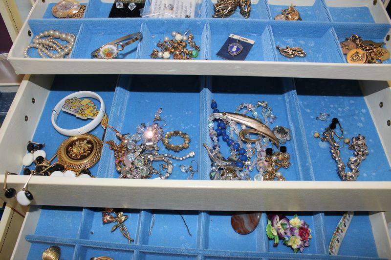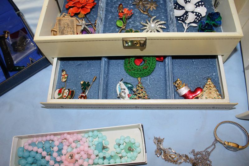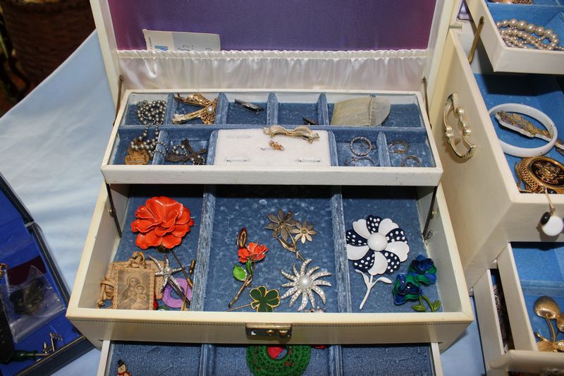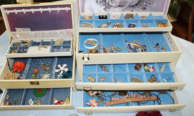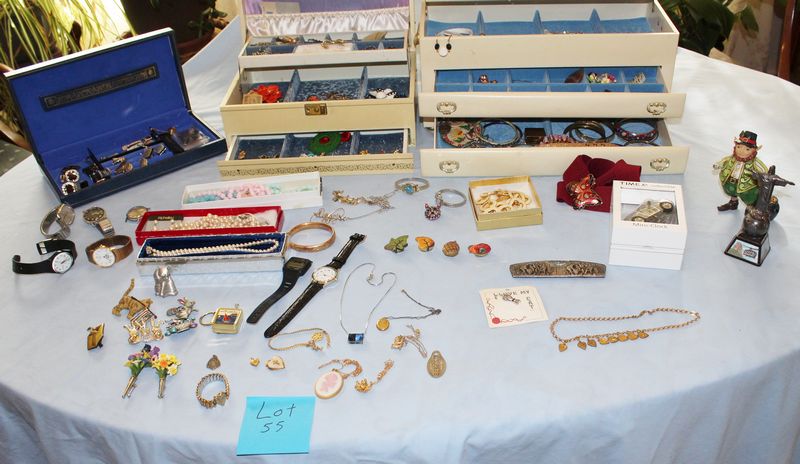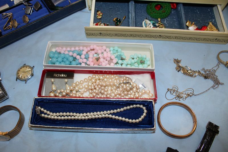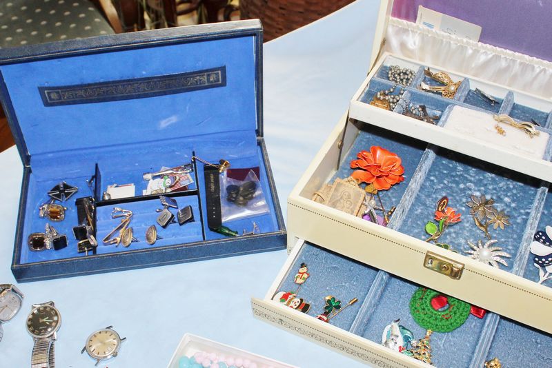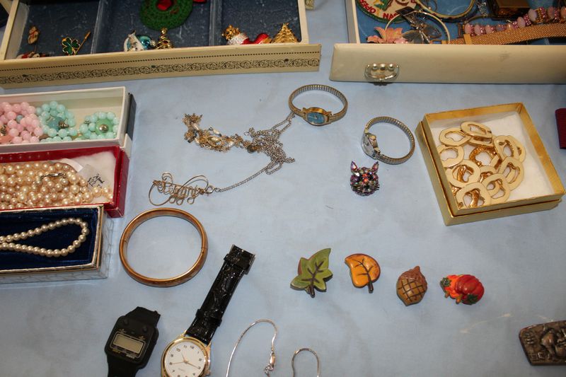 Costume jewelry including necklaces; bracelets; pins; watches; earrings; men's jewelry; jewelry boxes; etc.