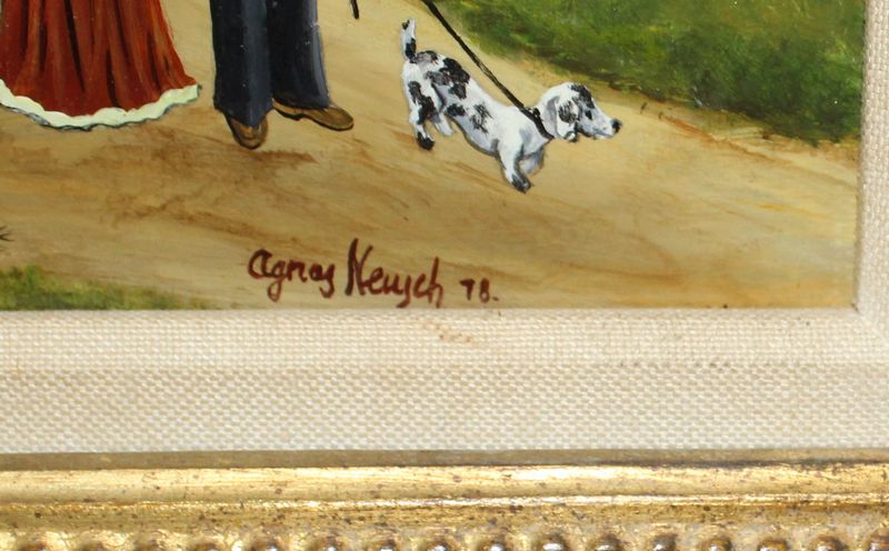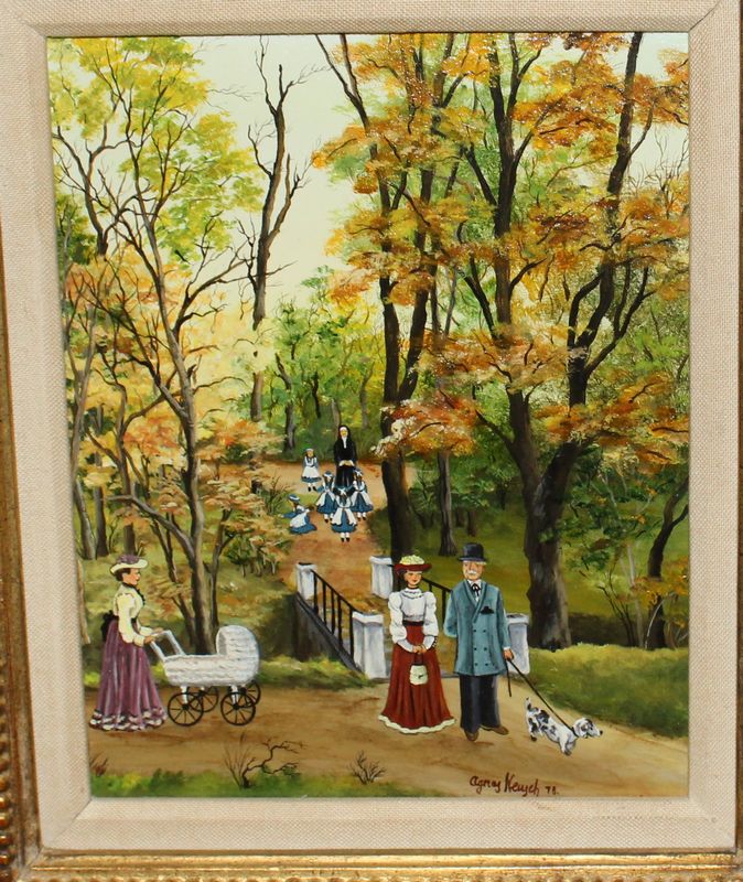 Agnes Neusch (B. 1947) painting on board of people walking in a park signed lower right and dated 1976, 9.5"Tx7.5"W