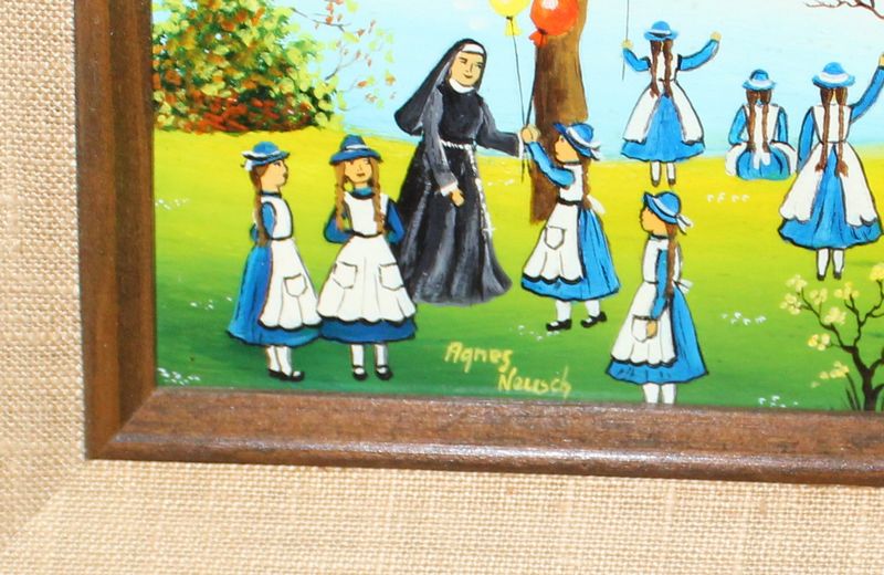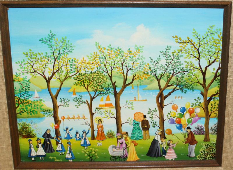 Agnes Neusch (B. 1947) painting on board of people in a riverside park, 8"Tx9.5"W signed bottom left.