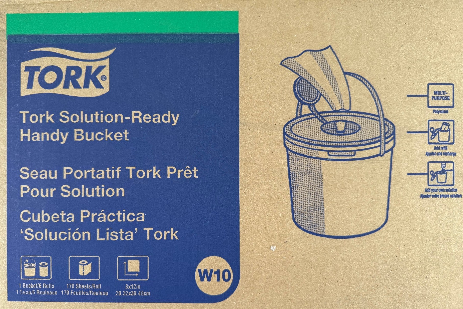 Tork Solution-Ready Cleaning Cloths with Plastic Refill Bucket; Each case includes a Plastic Bucket and (6) 110-Sheet Rolls of Cloth Cleaning Towels; Each Perforated Towel measures 8-inches x 12-inches. Pickup only.
