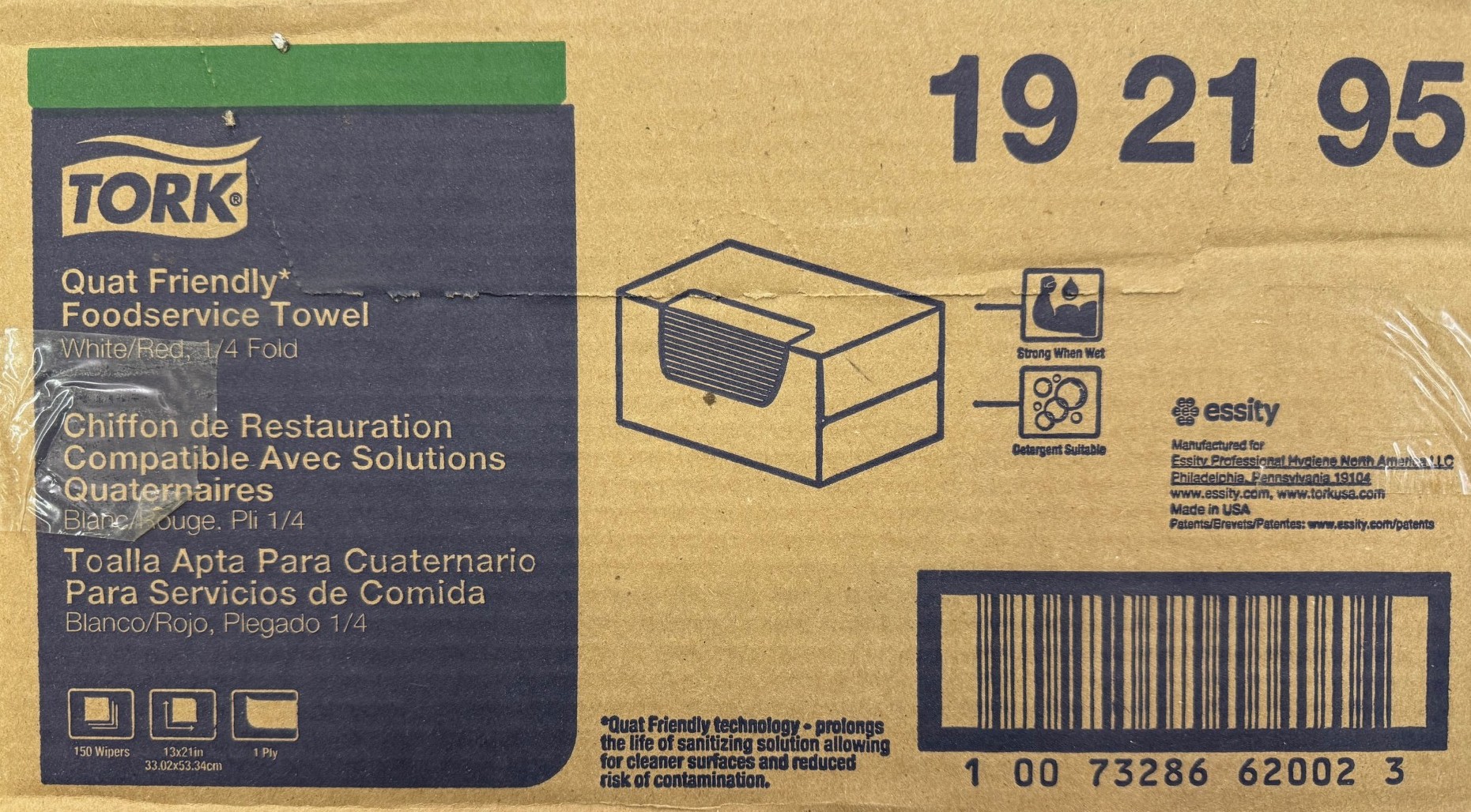 Tork Quat Friendly Food Service Towels - White & Red 1/4 Fold Towels; 150 13-inch x 21-inch 1-Ply Cloth Wiping Towels per Case. Pickup only.