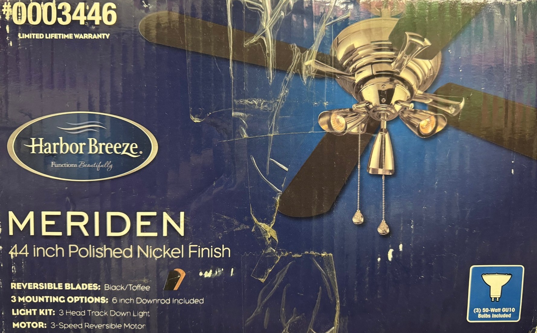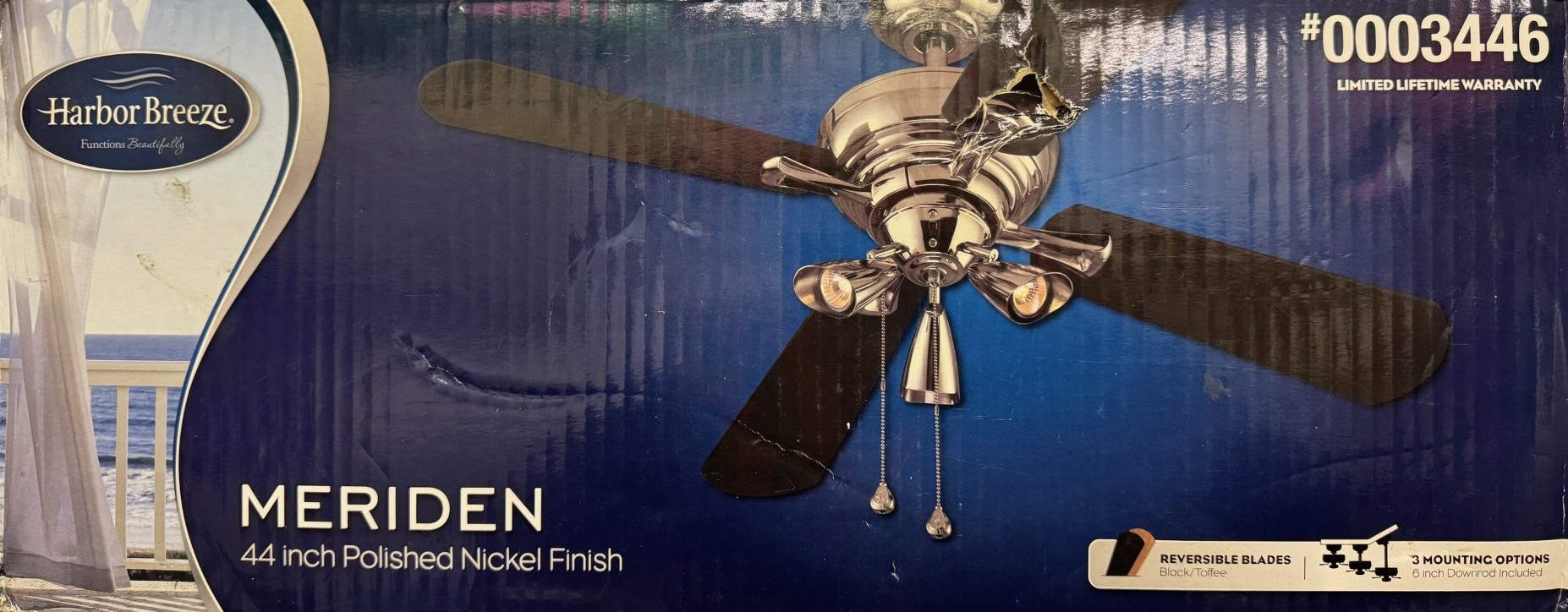 Harbor Breeze Meriden 44-inch 3-Speed / Reversible 4-Blade Ceiling Fan with Light Kit - Polished Nickel with Reversible Black / Toffee Blades; Includes a 6-inch Downrod. Pickup only.