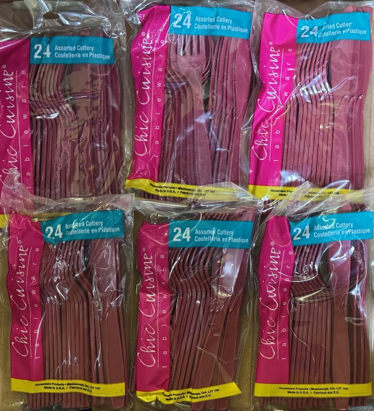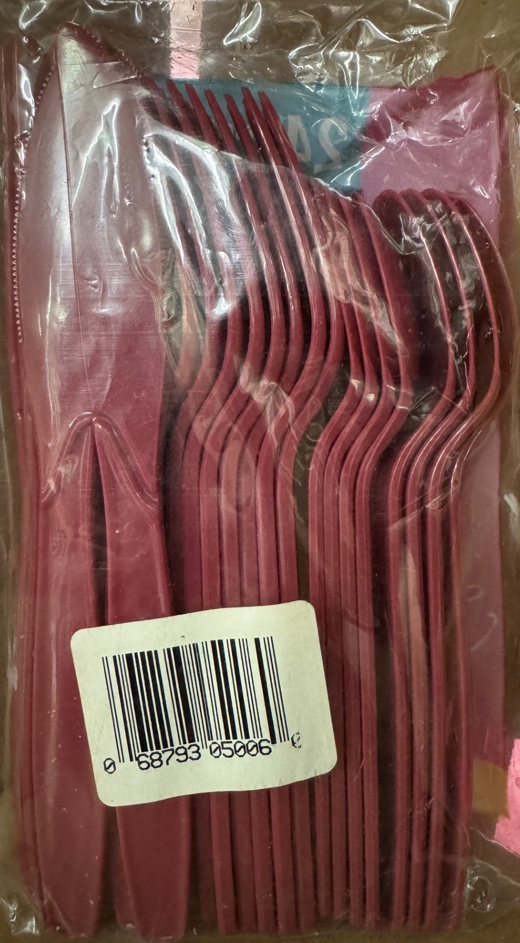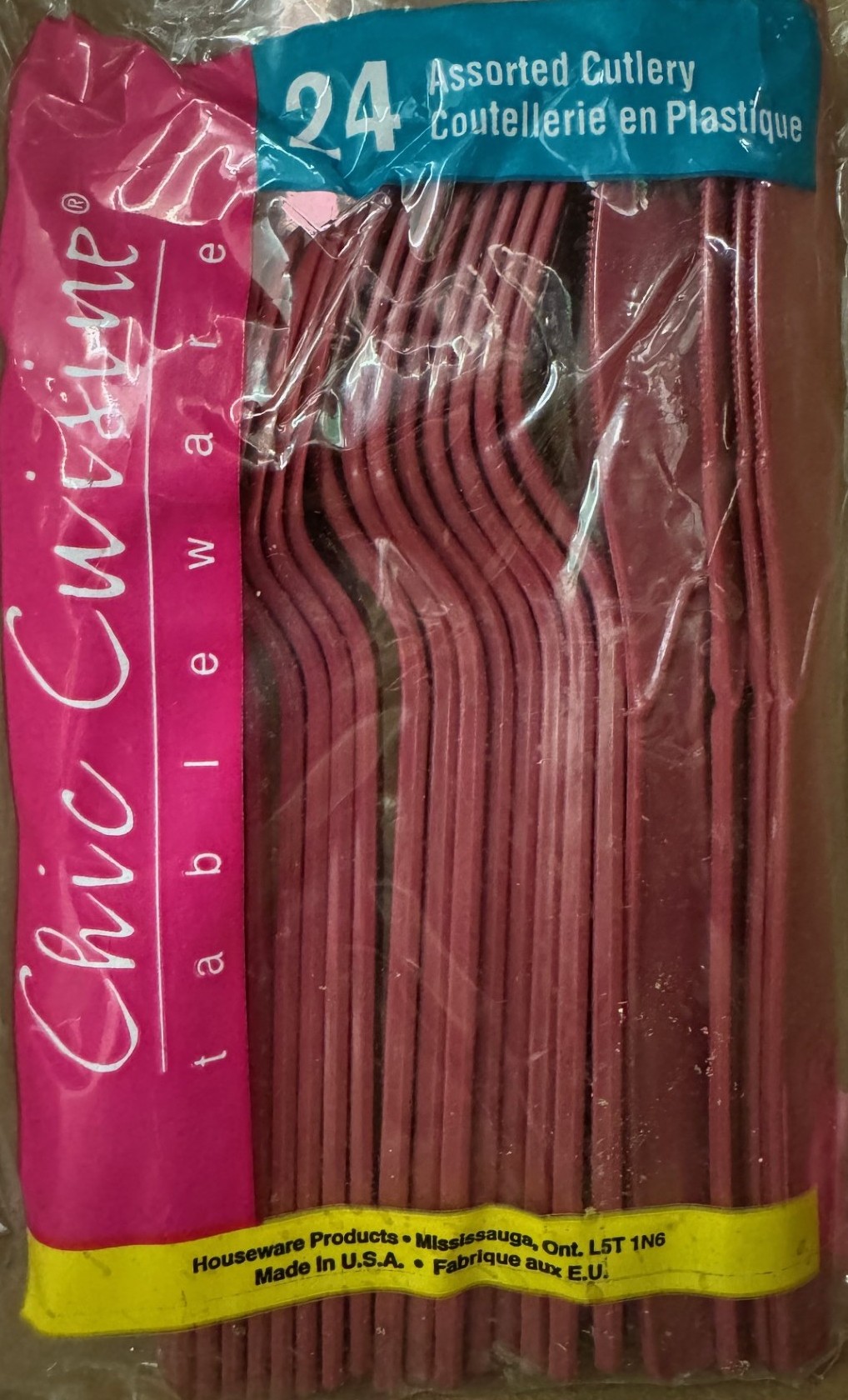 6 Packages Chic Cuisine Extra Heavy-Duty Plastic Cutlery - Burgundy Color / 24 -Pieces per Box (8 Knives/8 Forks/8 Spoons) 144 Pieces Total - Made in USA.