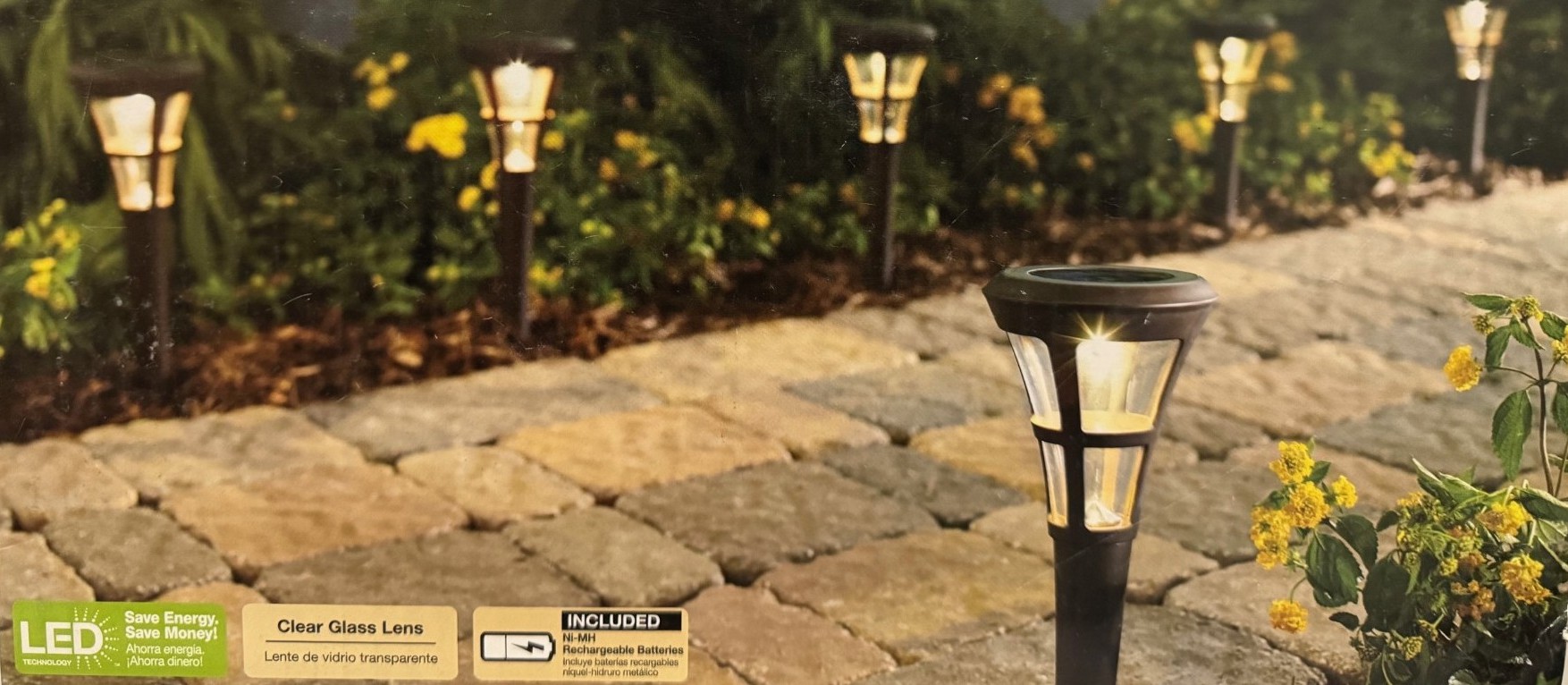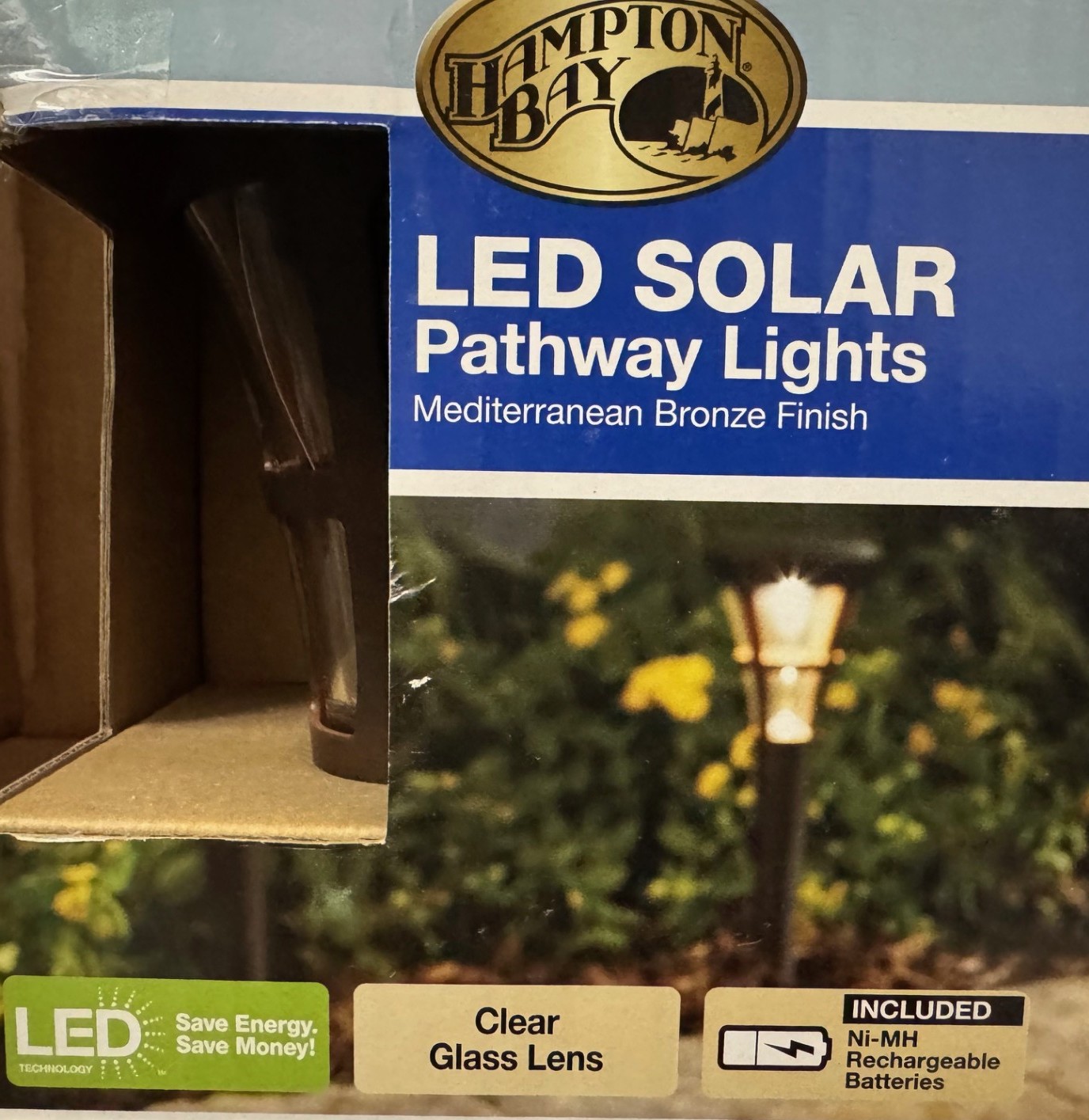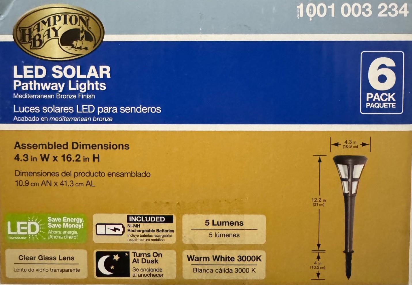 6 Hampton Bay Solar LED Pathway Lights - Mediterranean Bronze Finish with Clear Glass Lens - Each Path Light measures 4 3/8-inches Wide x 16 1/4-inches High.