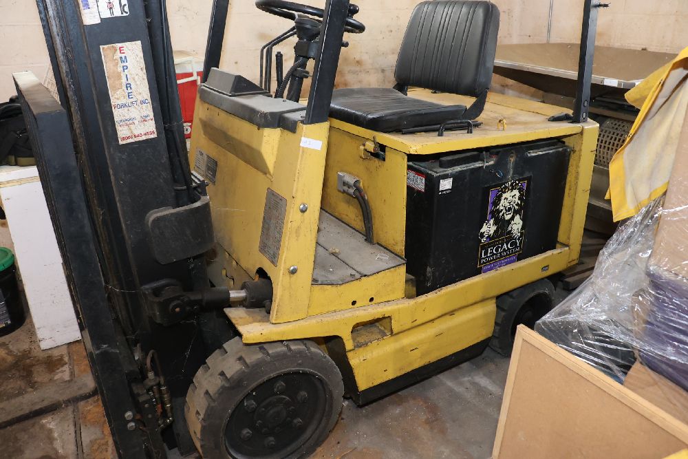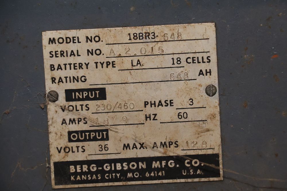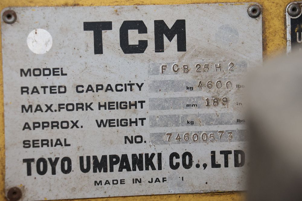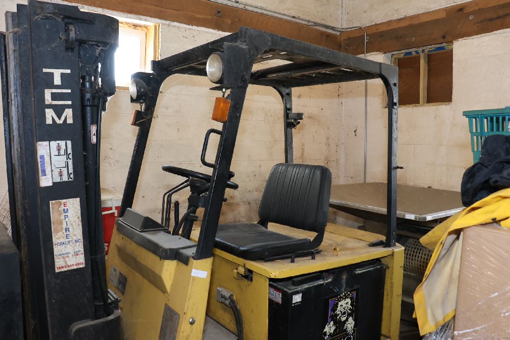TCM Forklift model #FCB25H2, SN 74600573, rated up to 4600 lbs. Hour meter reading 0206. Also includes Berg-Gibson MFG. charger model 18BR3-648. Seller reports believed to need new batteries. There will be a forklift onsite to assist in loading however the buyer is responsible for the proper and safe removal including bringing the proper tools, equipment and vehicle.