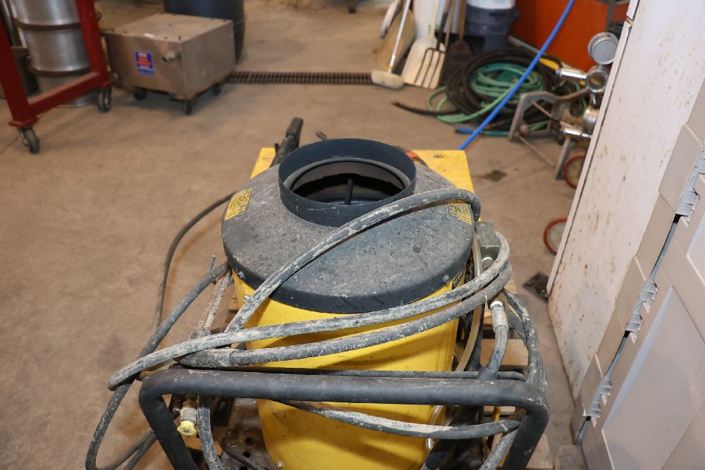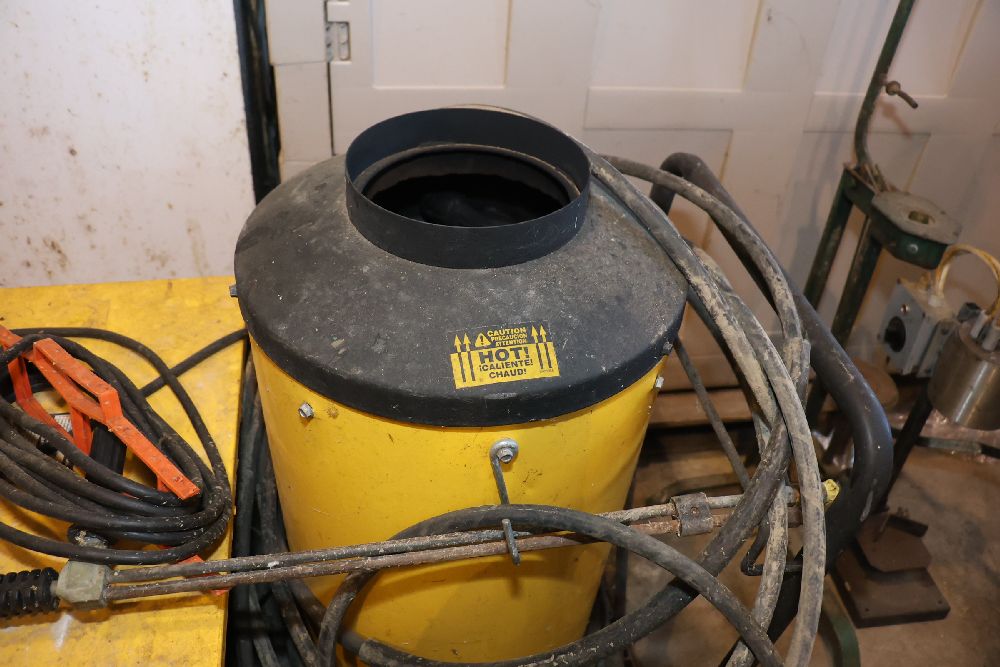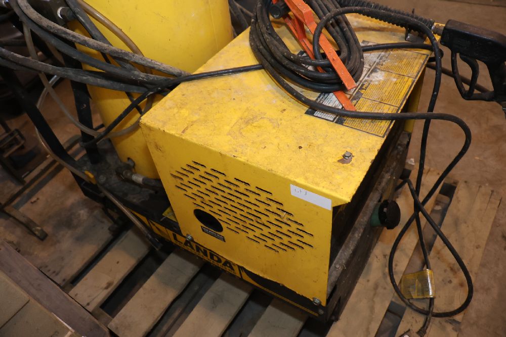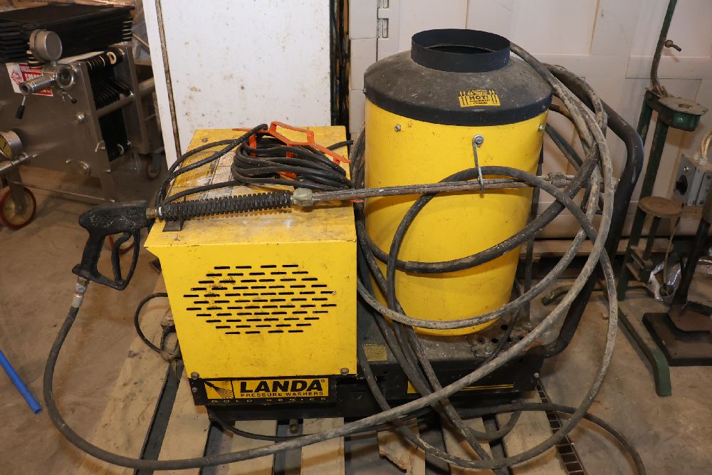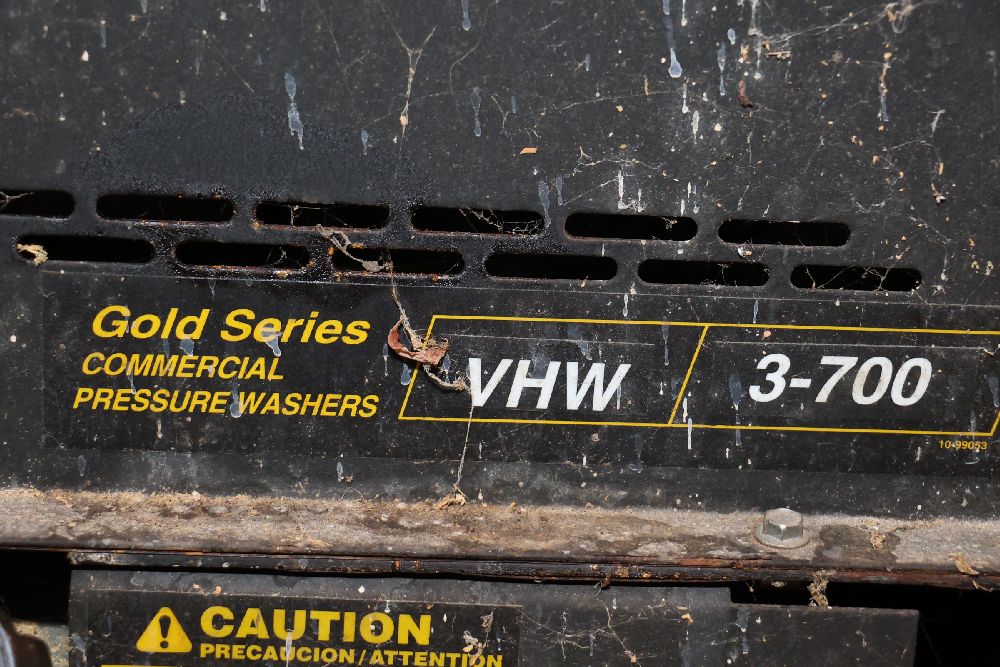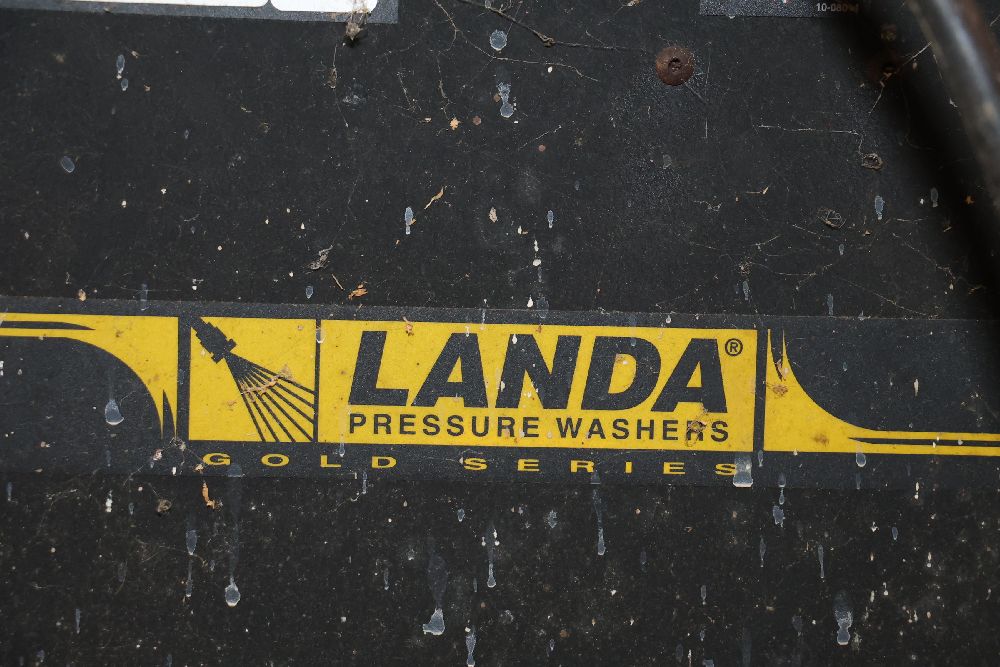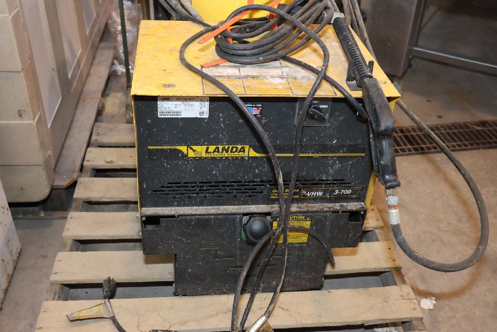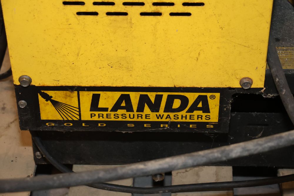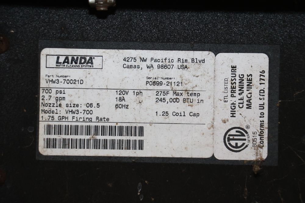 Landa VHW3-700 commercial pressure washer from the Gold Series, rated at 700 PSI and 2.7 GPM with a 120V single-phase motor and built-in hot water heating system. Includes integrated hose reel, spray wand, and control panel. Seller reports: worked when removed from service, current operating condition is unknown. There will be a forklift onsite to assist in loading however the buyer is responsible for the proper and safe removal including bringing the proper tools, equipment and vehicle.