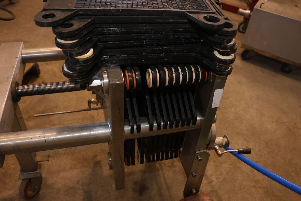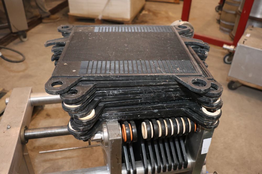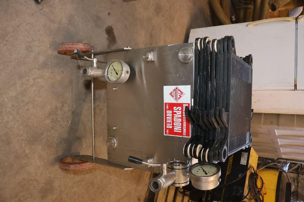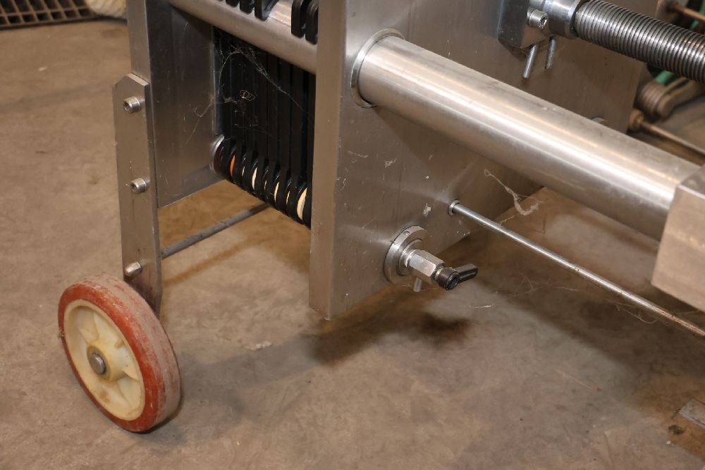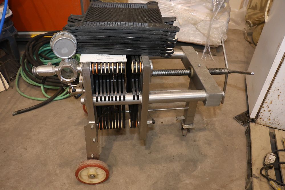 Stainless steel Spadoni OMESS plate and frame filter press with multiple filter plates, pressure gauges, sight glass, and hand-crank clamping system. Mounted on casters.19 plates total. There will be a forklift onsite to assist in loading however the buyer is responsible for the proper and safe removal including bringing the proper tools, equipment and vehicle.