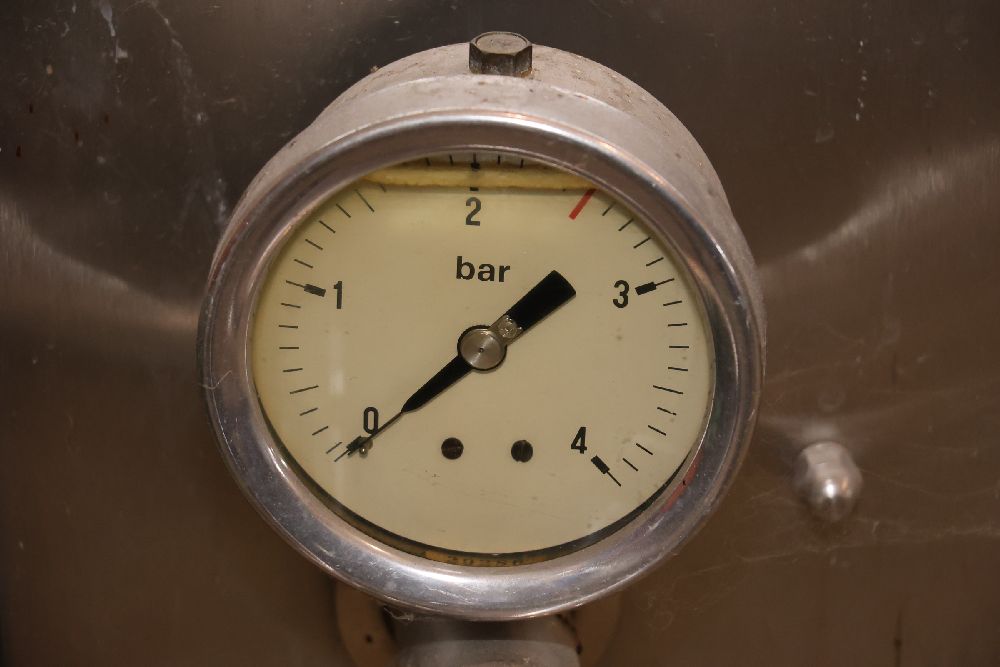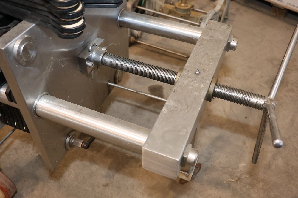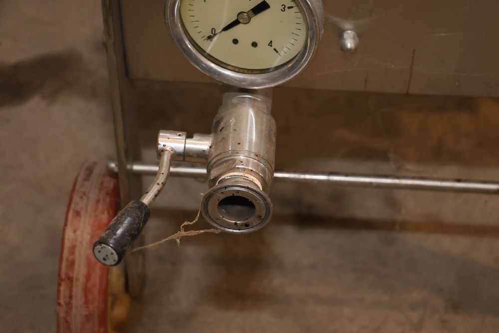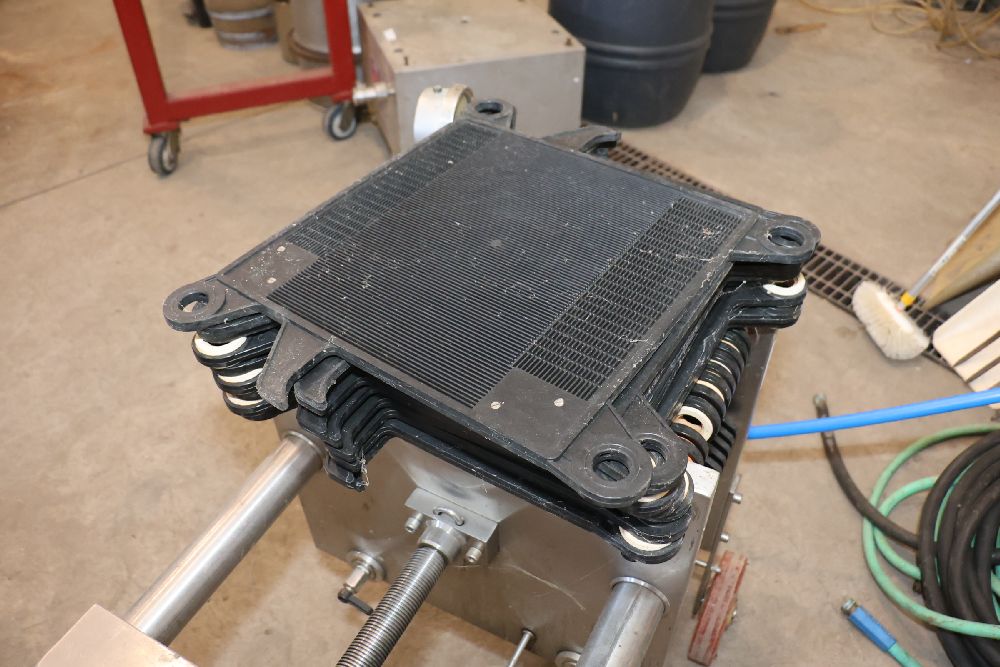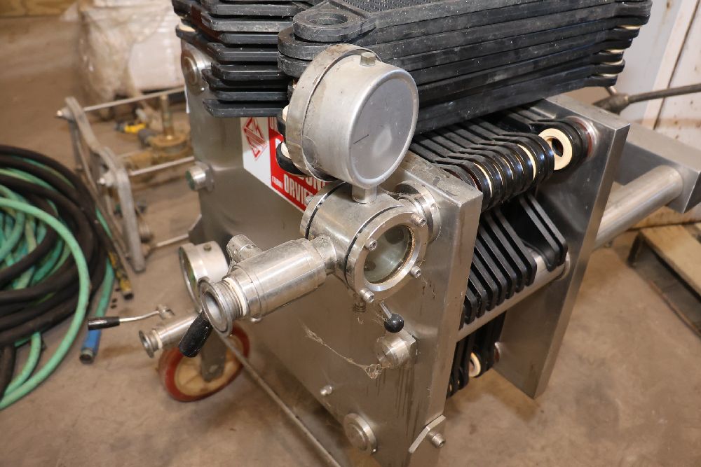 Stainless steel Spadoni OMESS plate and frame filter press with multiple filter plates, pressure gauges, sight glass, and hand-crank clamping system. Mounted on casters.19 plates total. There will be a forklift onsite to assist in loading however the buyer is responsible for the proper and safe removal including bringing the proper tools, equipment and vehicle.