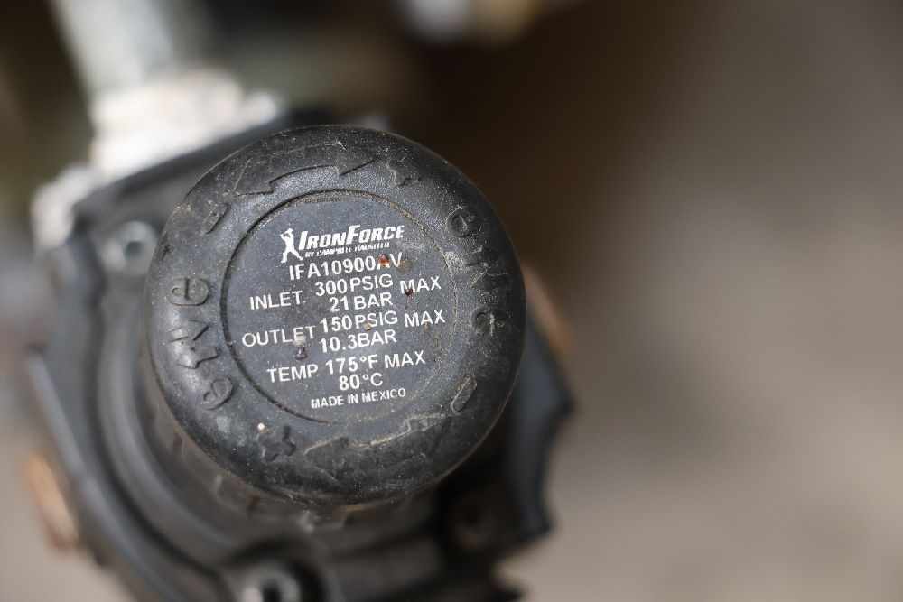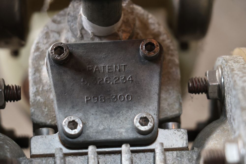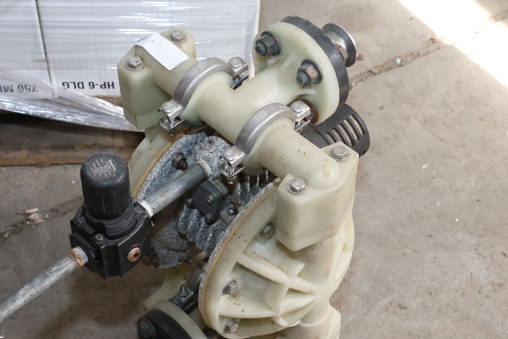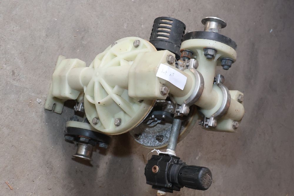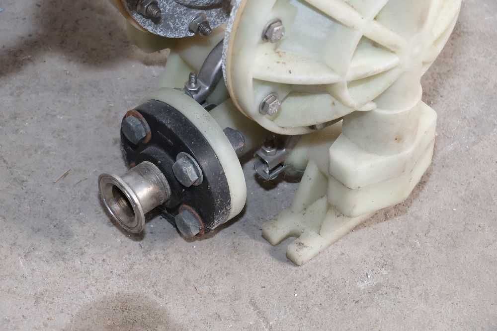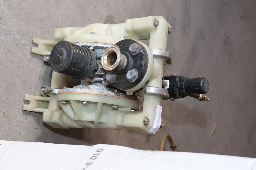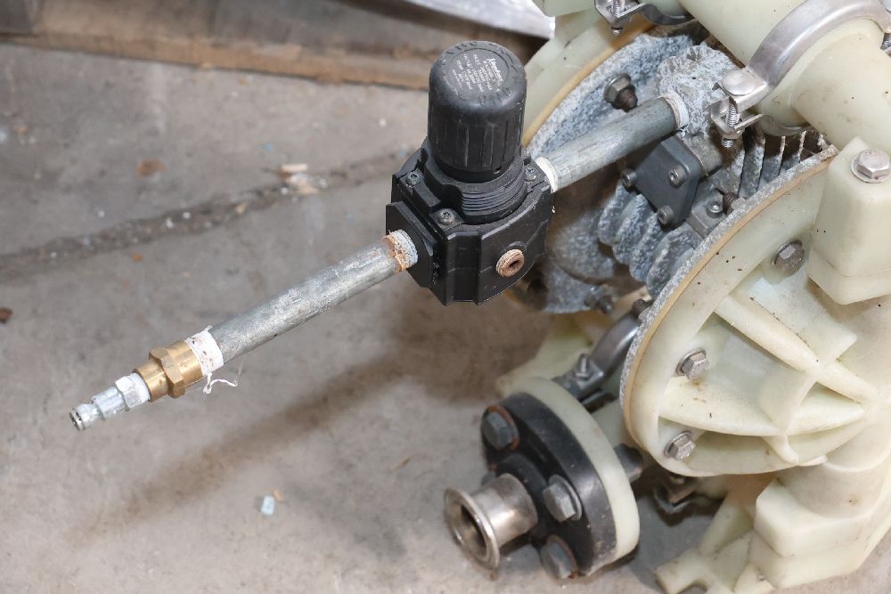 Plastic and metal diaphragm pump with tri-clamp fittings and an inline air pressure regulator. Marked with patent number 5,262,234 and model code P98-300. Seller reports: worked when removed from service, current operating condition is unknown. There will be a forklift onsite to assist in loading however the buyer is responsible for the proper and safe removal including bringing the proper tools, equipment and vehicle.