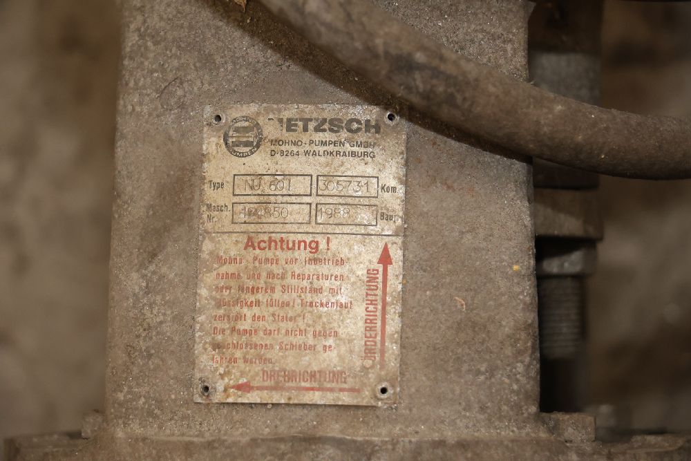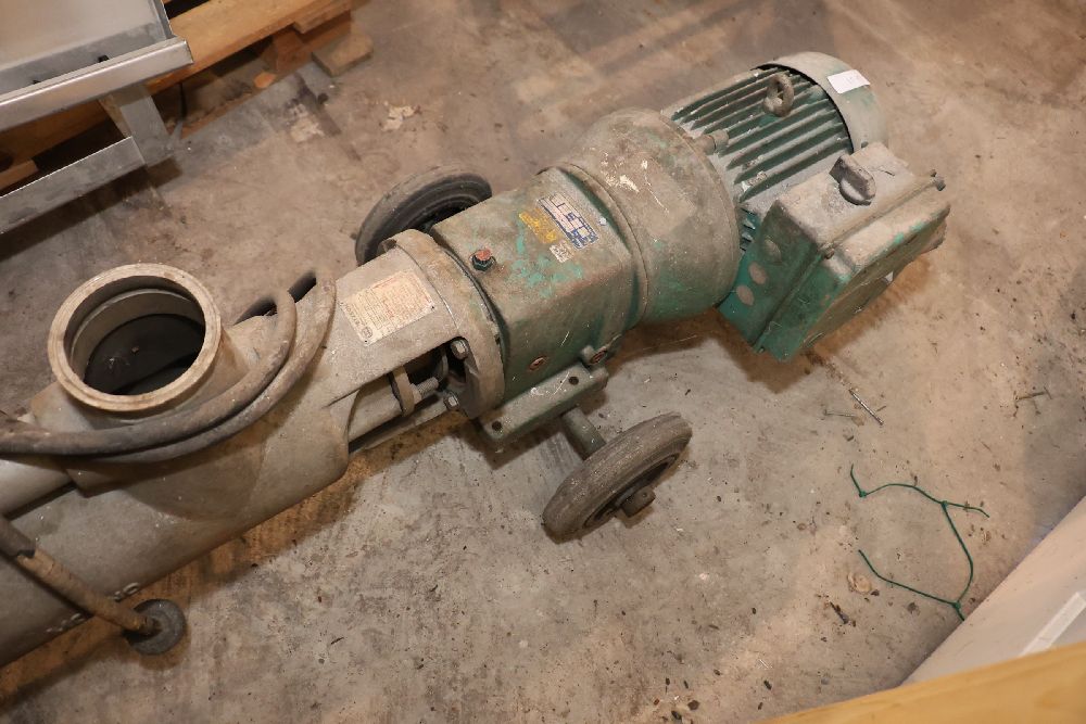 Eccentric worm pump type DC34- 2049-NK-3007. Seller reports: worked when removed from service, current operating condition is unknown. There will be a forklift onsite to assist in loading however the buyer is responsible for the proper and safe removal including bringing the proper tools, equipment and vehicle.