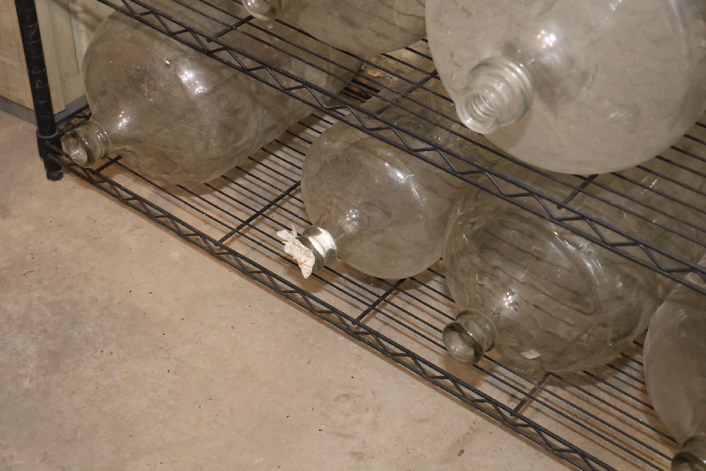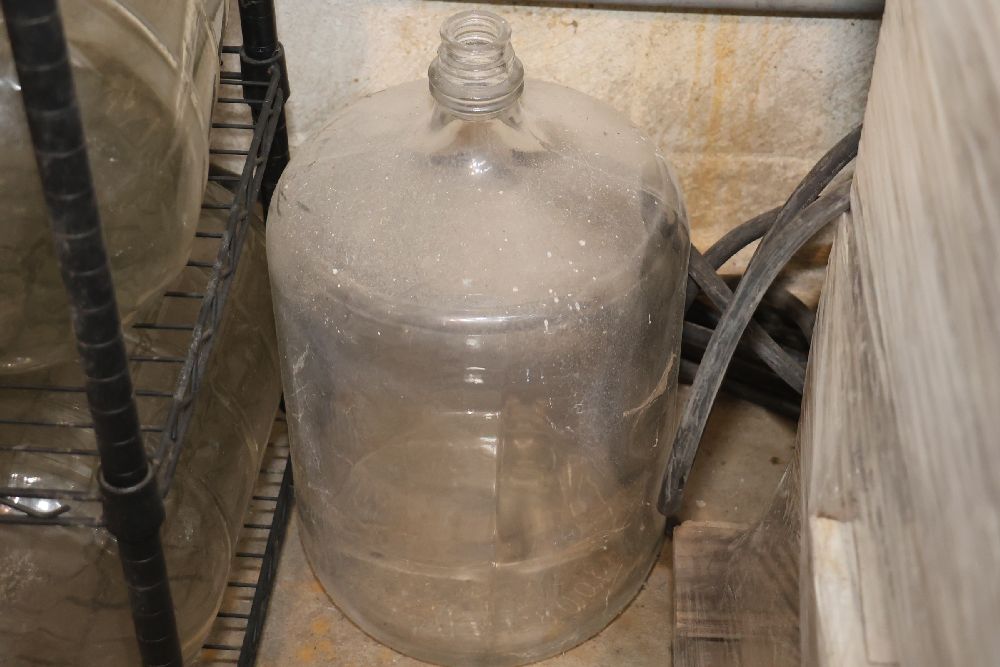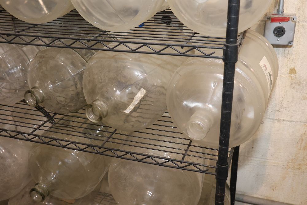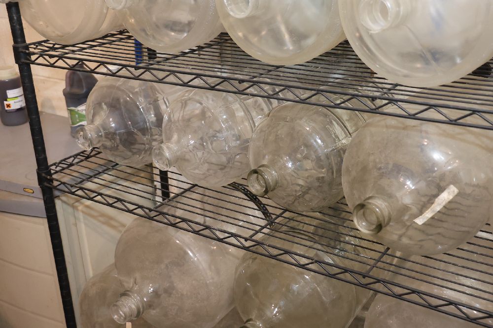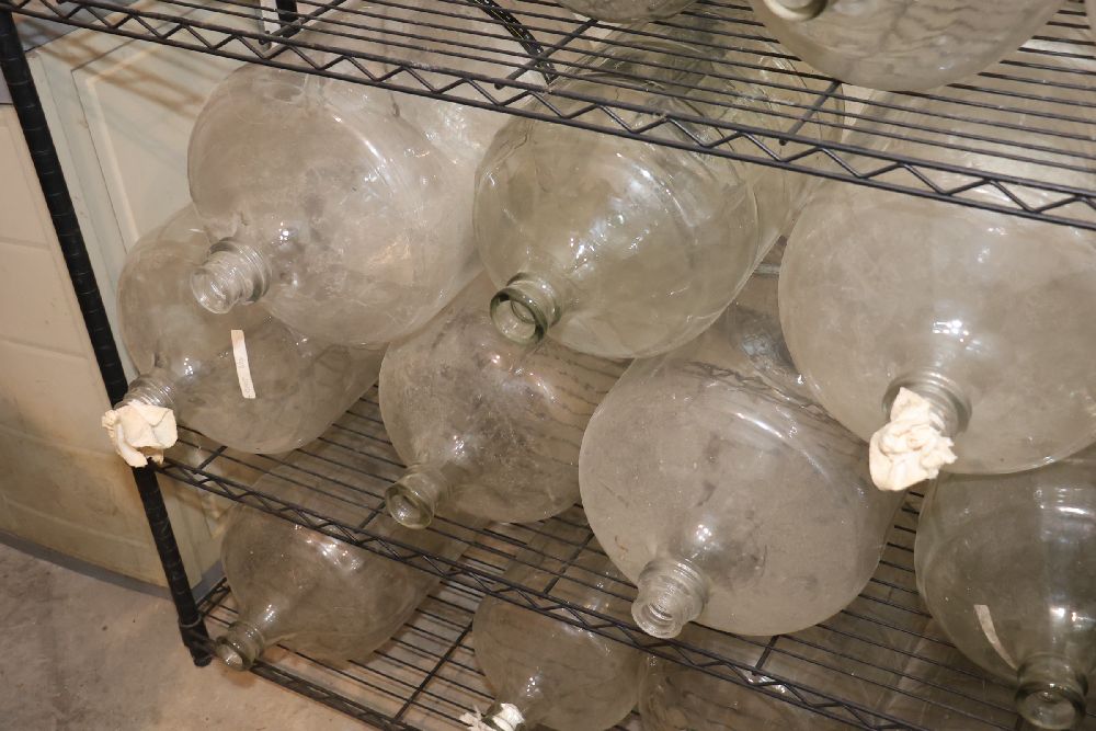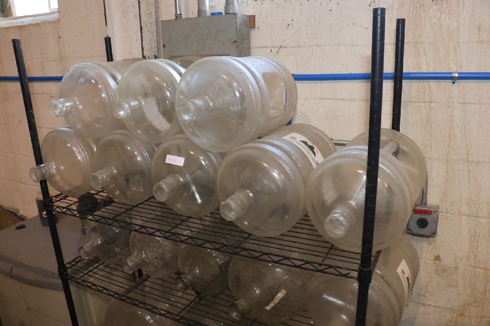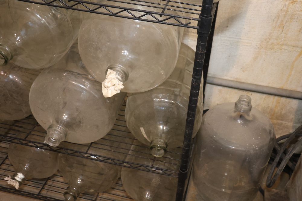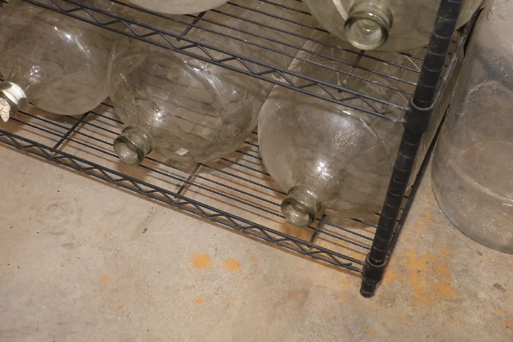 Shelving unit with jugs including: 2 gallon jugs glass, 5 gallon jugs plastic, approx. 8 gallon jugs glass, 5 gallon jugs glass. There will be a forklift onsite to assist in loading however the buyer is responsible for the proper and safe removal including bringing the proper tools, equipment and vehicle.
