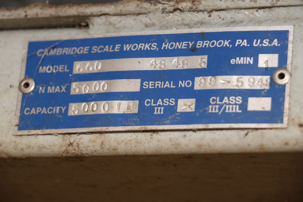 Cambridge pallet scale model 660 48 48 .5. With component parts, and 5000lb capacity. Seller reports: worked when removed from service, current operating condition is unknown. There will be a forklift onsite to assist in loading however the buyer is responsible for the proper and safe removal including bringing the proper tools, equipment and vehicle.