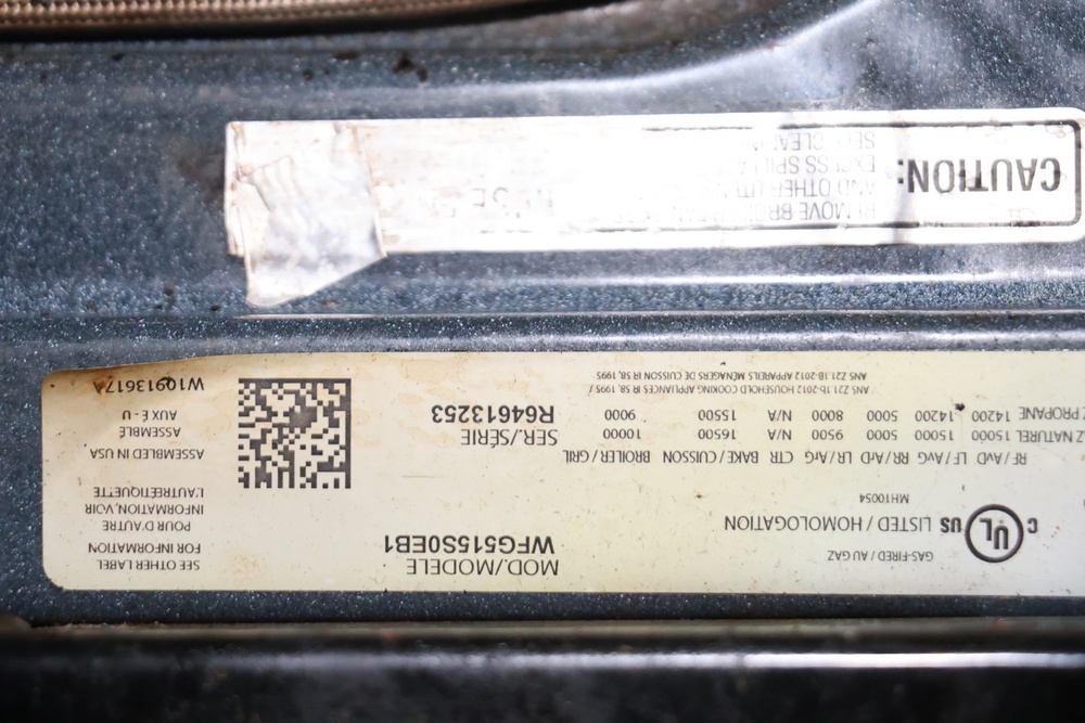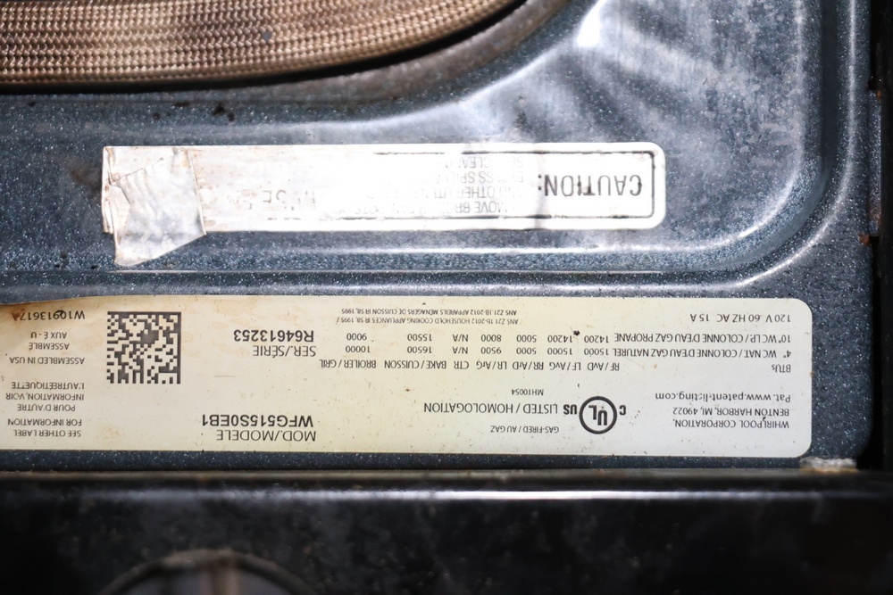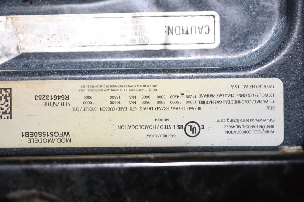 Whirlpool freestanding gas range, model WFG515S0EB1. It includes four burners, electronic controls with baking, broiling, and self-cleaning functions, and a spacious oven interior. Powered by natural gas or convertible to propane.