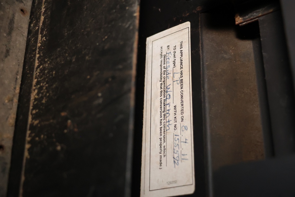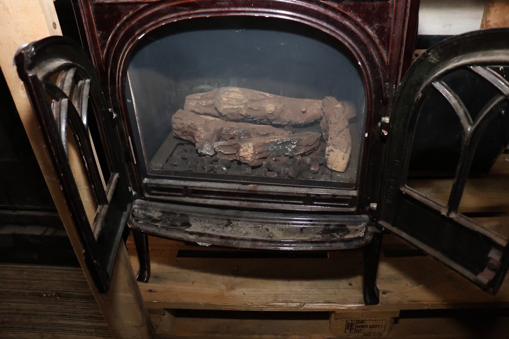 Decorative cast iron gas stove with an ornate front design and arched glass doors. It has been converted to LP (liquid propane) fuel using conversion kit #155592, as noted by Fireside Warmth. The unit connects via a flexible gas line.