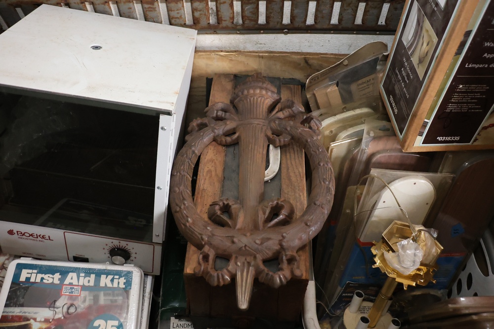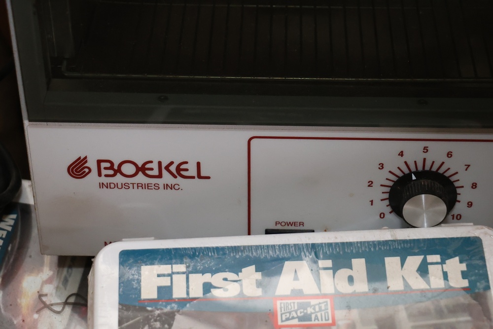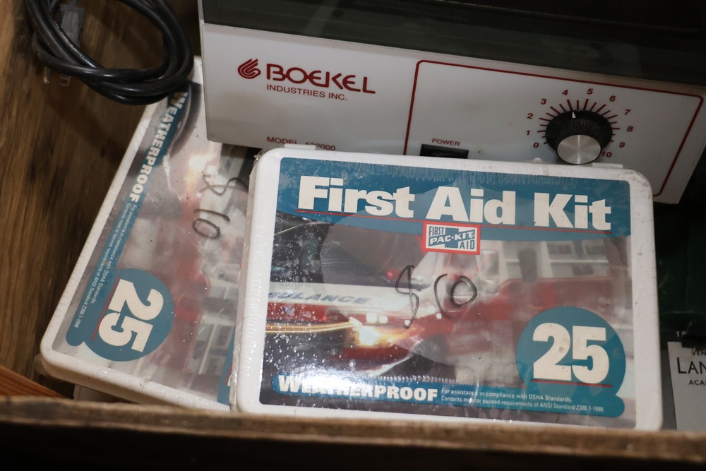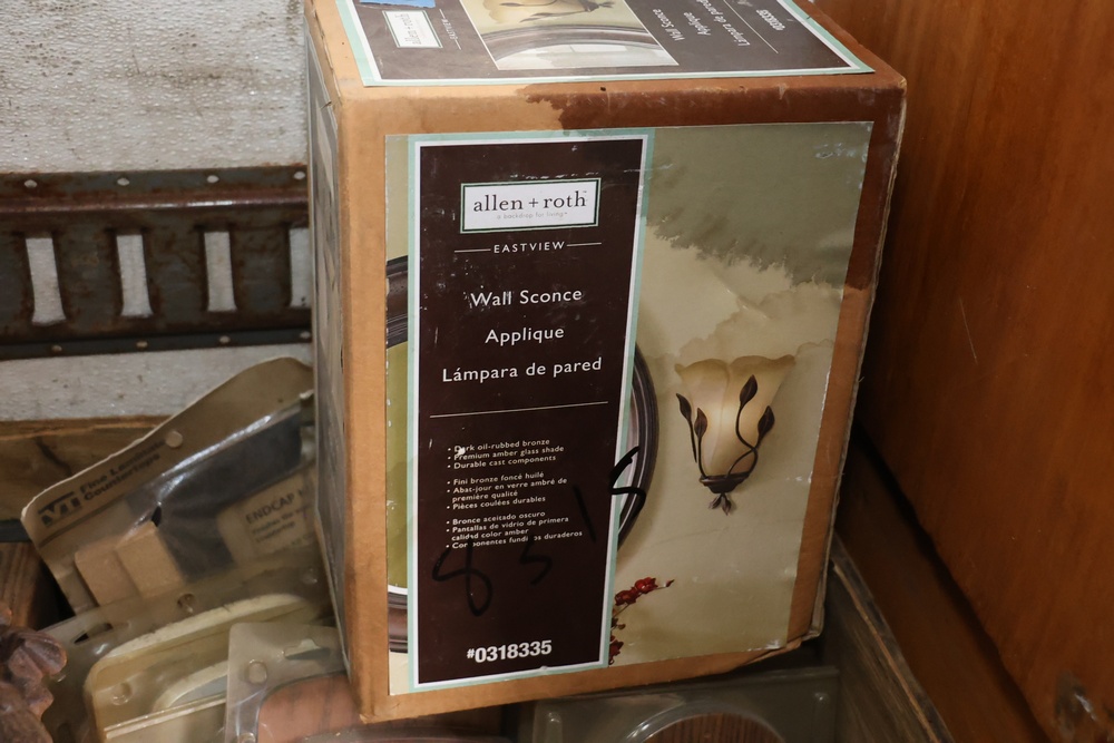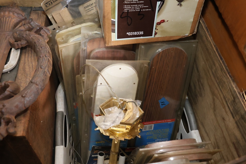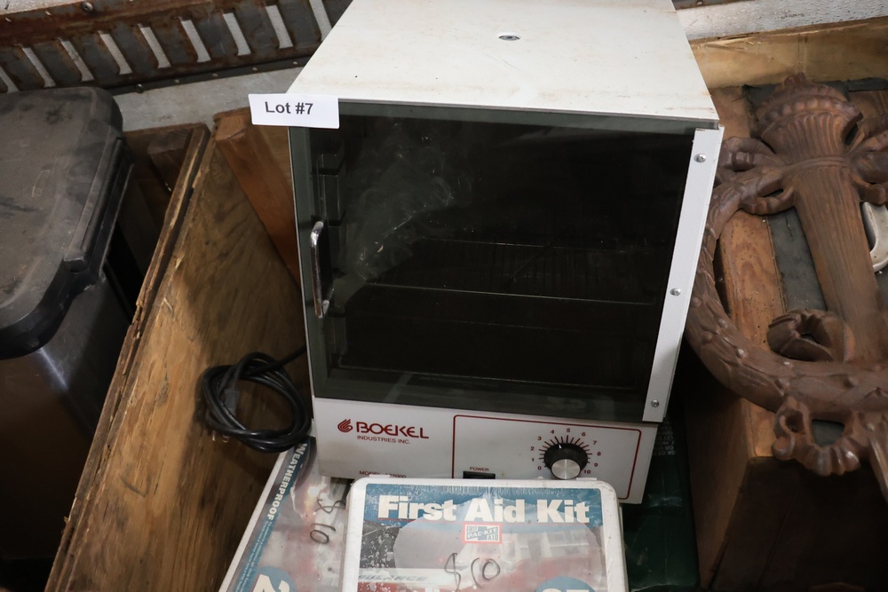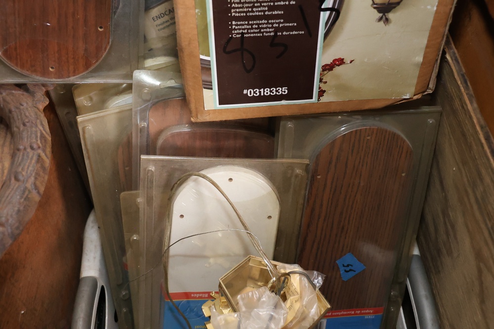 Mixed group of household and hardware items, including a Boekel laboratory oven (Model 139000), assorted waterproof first aid kits, an Allen + Roth wall sconce light fixture, Westinghouse 52" reversible ceiling fan blade set, assorted ceiling fan blade kits, a boxed Landmark Plus antique brass ceiling fan. Also included are various lighting components, decorative hardware, Vintage Sewing Machine Evernice brand With Champion motor, appears complete, Nat Sherman Tobacco Display Case – Glass/wood retail-style cabinet, and a cast metal wall décor piece.